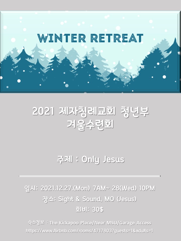 청년부 겨울 수련회 페이지 정보 작성자 달라스제자침례교회 날짜 2022-02-02 12:46 목록 본문 장소: Sight & Sound Theatre MO 이전글중고등부 겨울 수련회 22.02.02 다음글성탄절 교육부 행사 22.02.02 댓글 0 댓글목록 등록된 댓글이 없습니다. 목록
