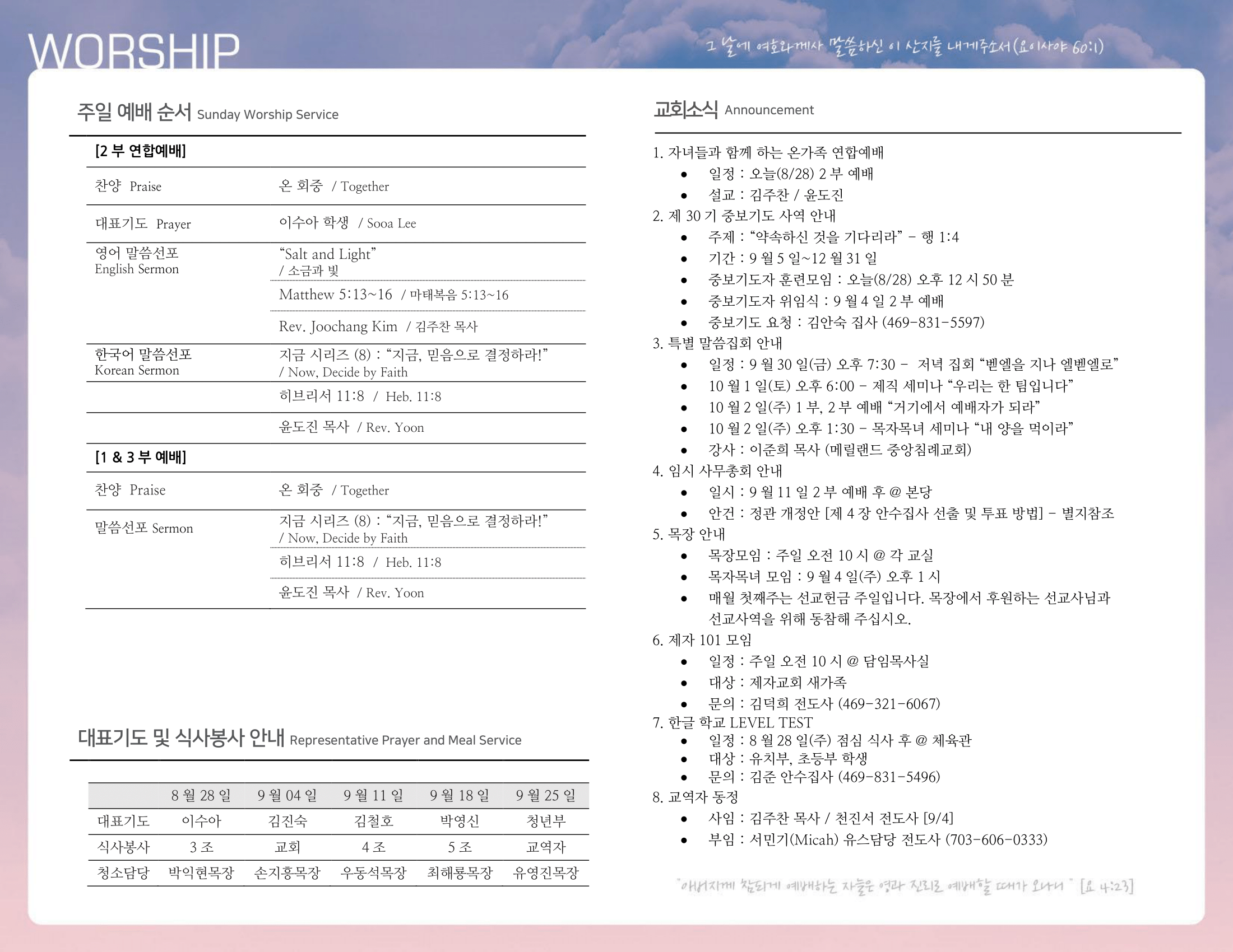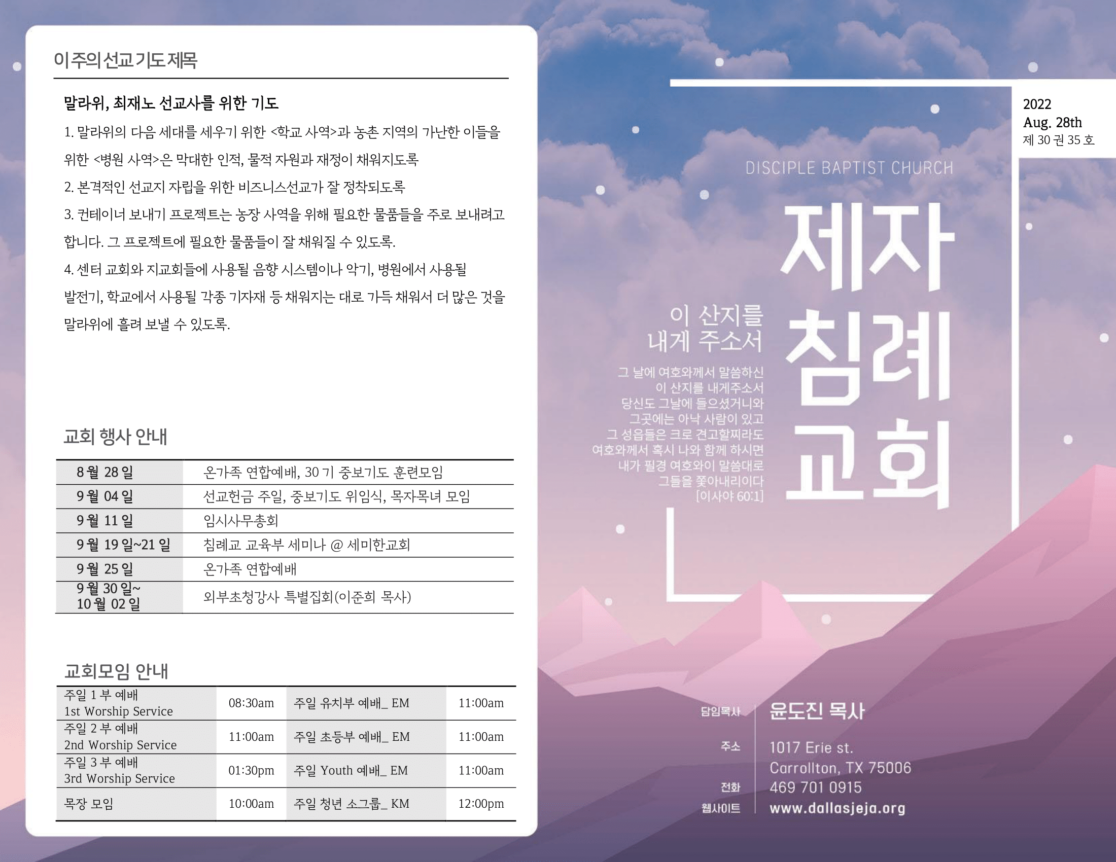 (2022.08.28) 주일 주보 페이지 정보 작성자 달라스제자침례교회 댓글 0건 조회 648회 작성일 22-08-27 14:44 목록 본문 (2022.08.28) 주일 주보 이전글(2022.09.04) 주일 주보 22.09.03 다음글(2022.08.21) 주일 주보 22.08.20
