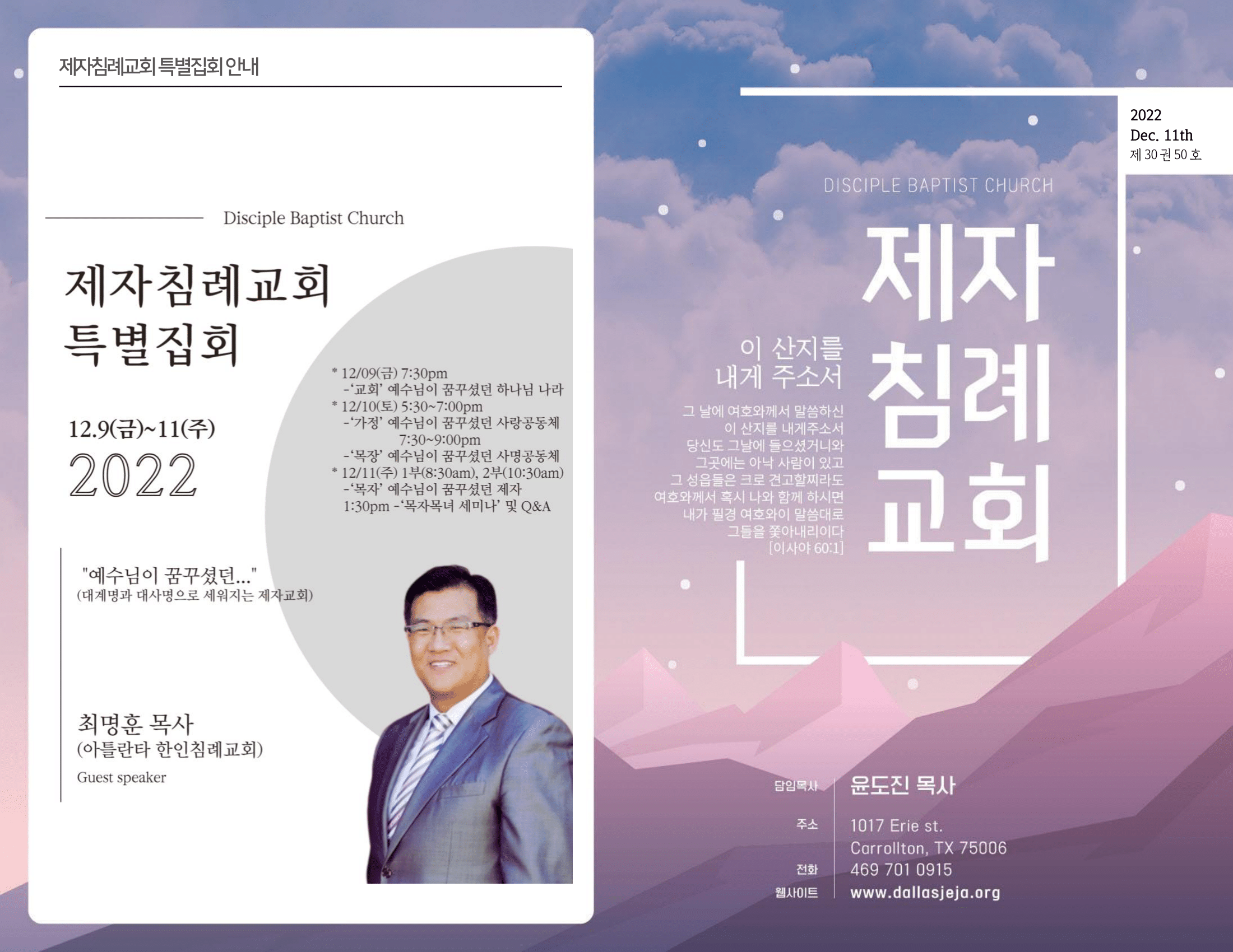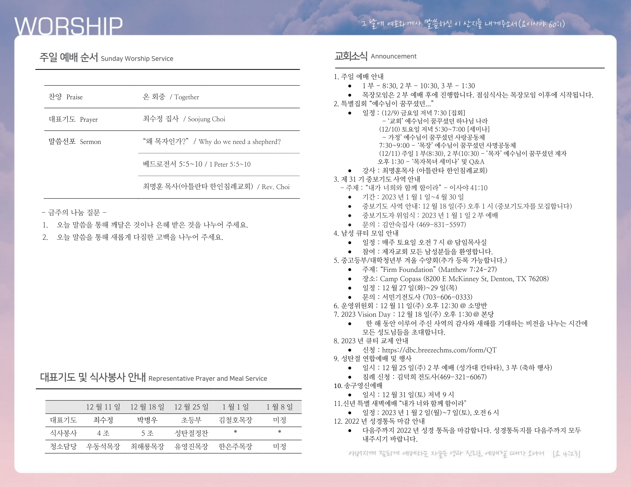 (2022.12.11) 주일 주보 페이지 정보 작성자 달라스제자침례교회 댓글 0건 조회 658회 작성일 22-12-10 15:03 목록 본문 (2022.12.11) 주일 주보 이전글(2022.12.18) 주일 주보 22.12.17 다음글(2022.12.04) 주일 주보 22.12.03