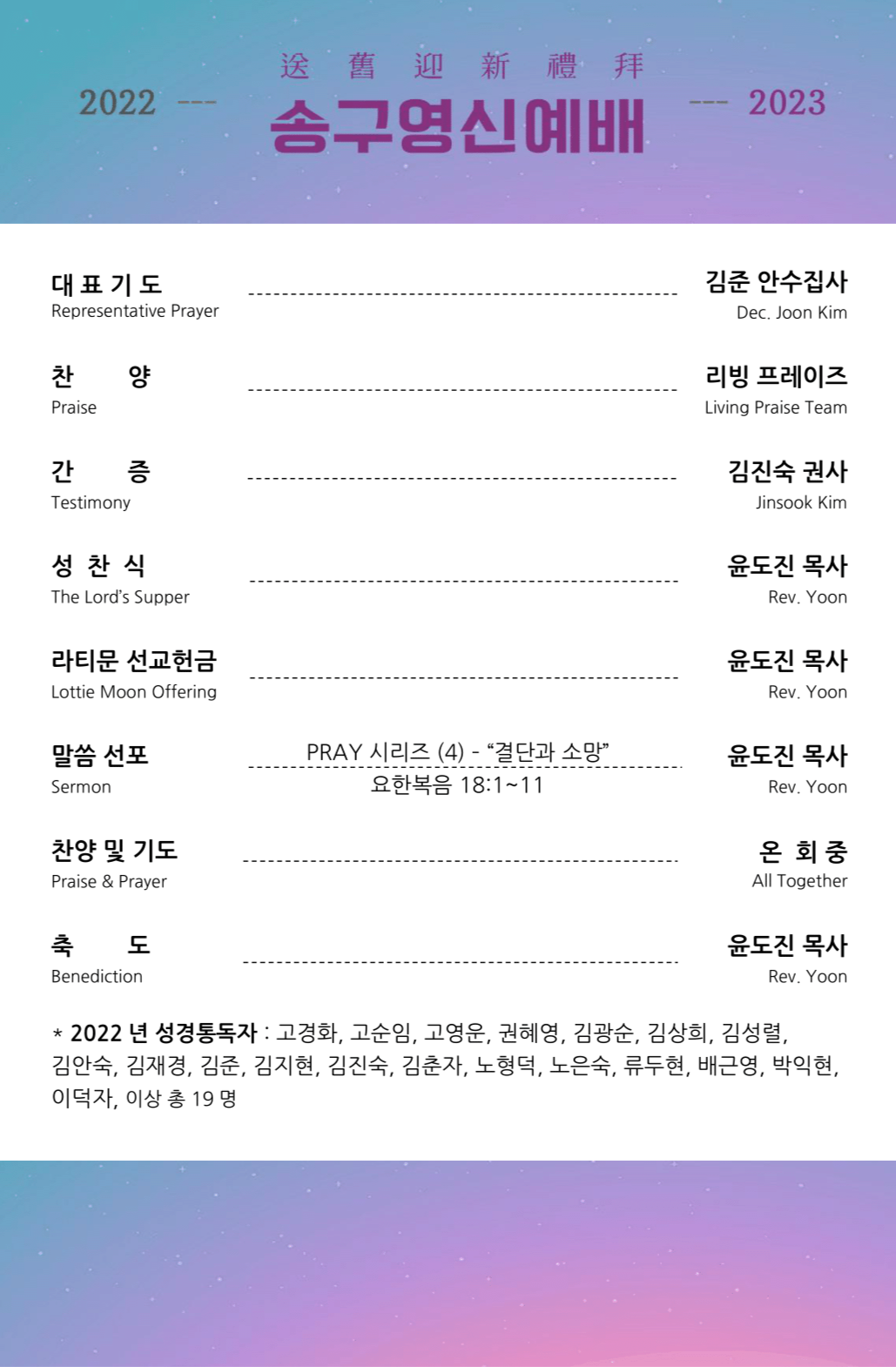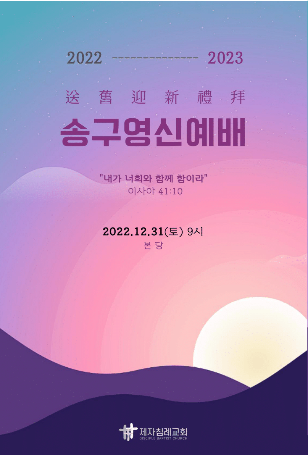 (2022.12.31) 송구영신예배 주보 페이지 정보 작성자 달라스제자침례교회 댓글 0건 조회 881회 작성일 22-12-29 17:42 목록 본문 (2022.12.31) 송구영신예배 주보 이전글(2023.1.1) 주일예배 주보 22.12.31 다음글(2022.12.25) 주일 주보 22.12.24