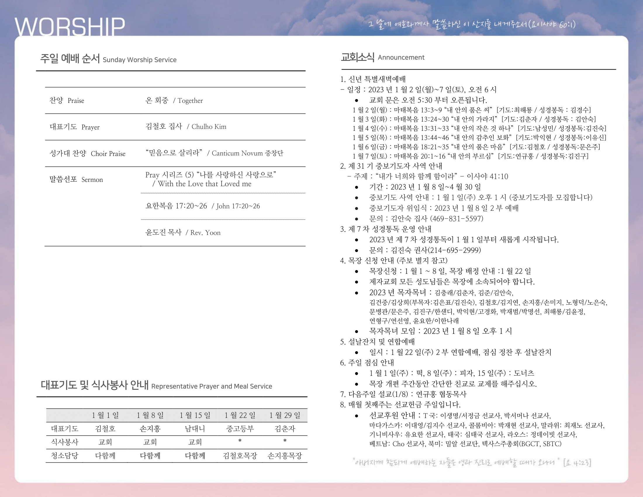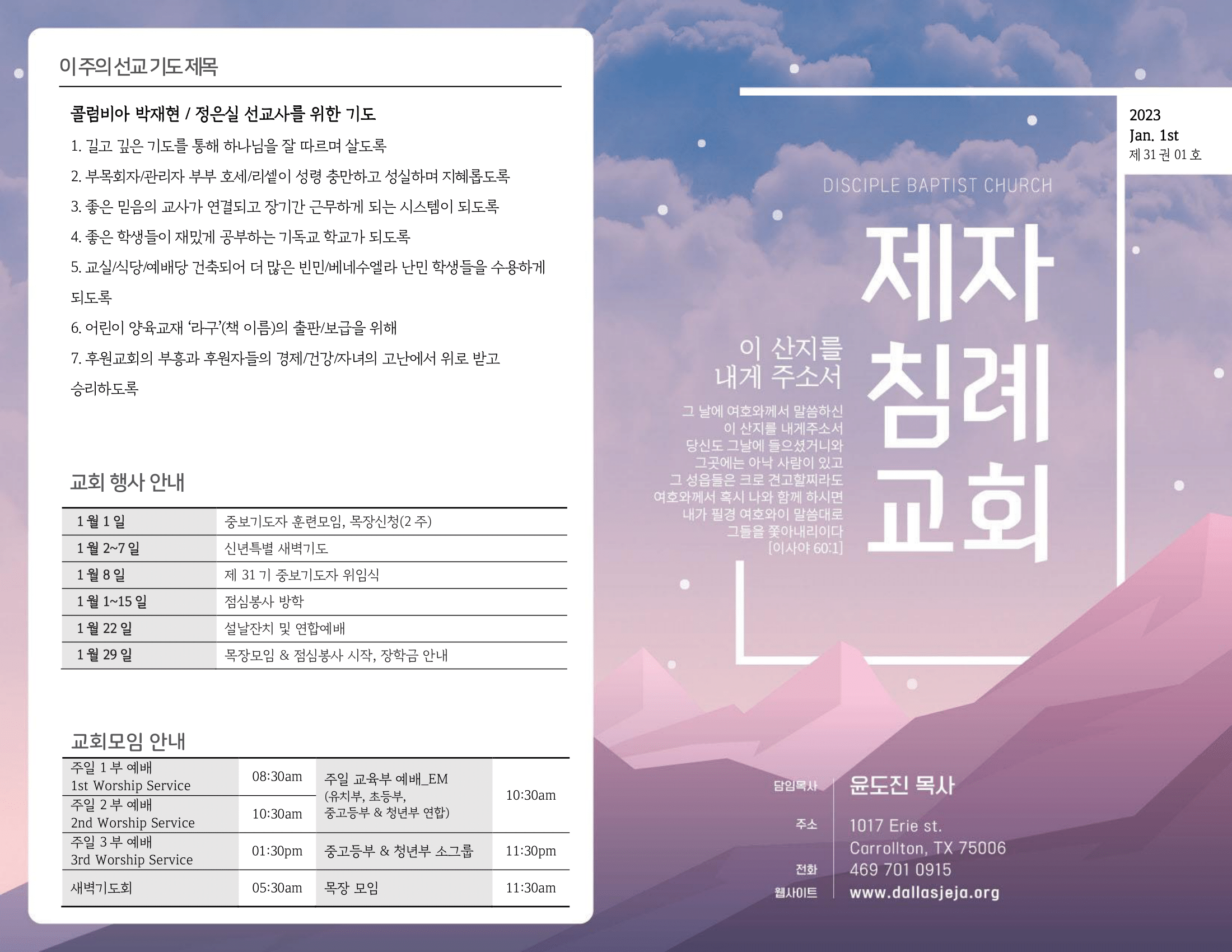(2023.1.1) 주일예배 주보 페이지 정보 작성자 달라스제자침례교회 댓글 0건 조회 665회 작성일 22-12-31 12:48 목록 본문 (2023.1.1) 주일예배 주보 이전글(2023.1.8) 주일예배 주보 23.01.07 다음글(2022.12.31) 송구영신예배 주보 22.12.29