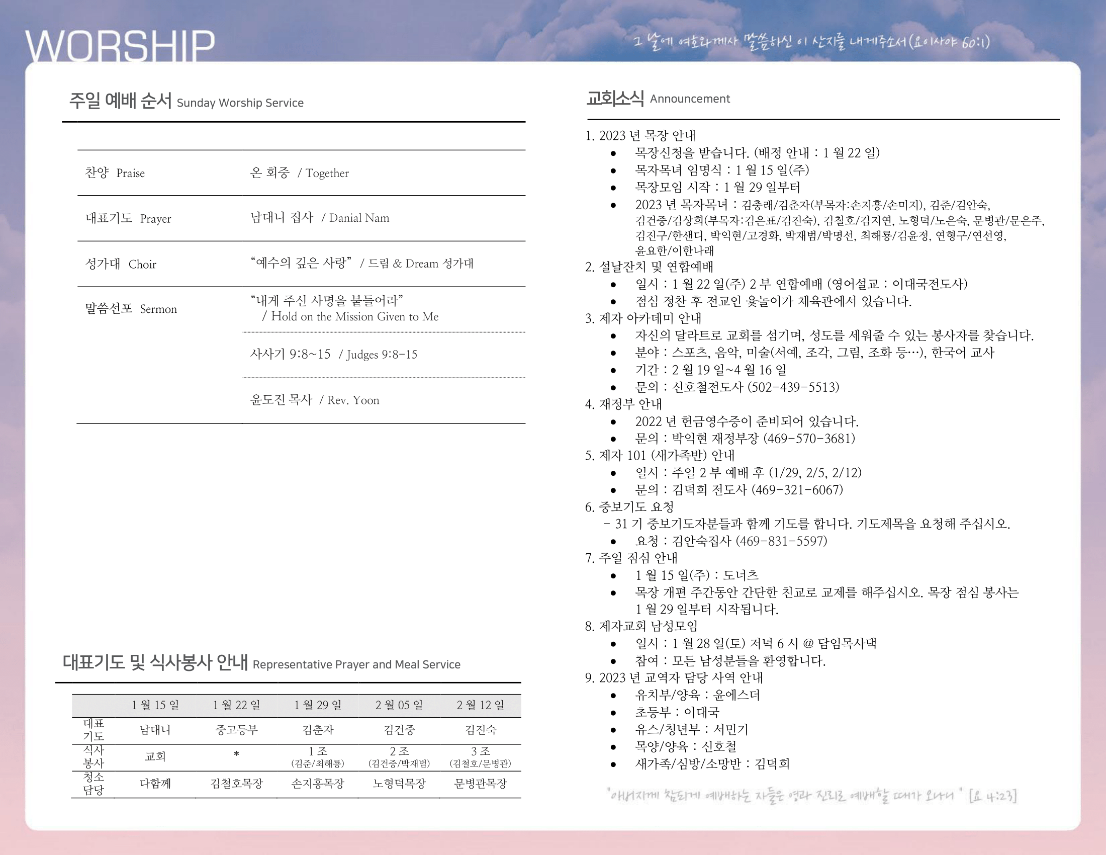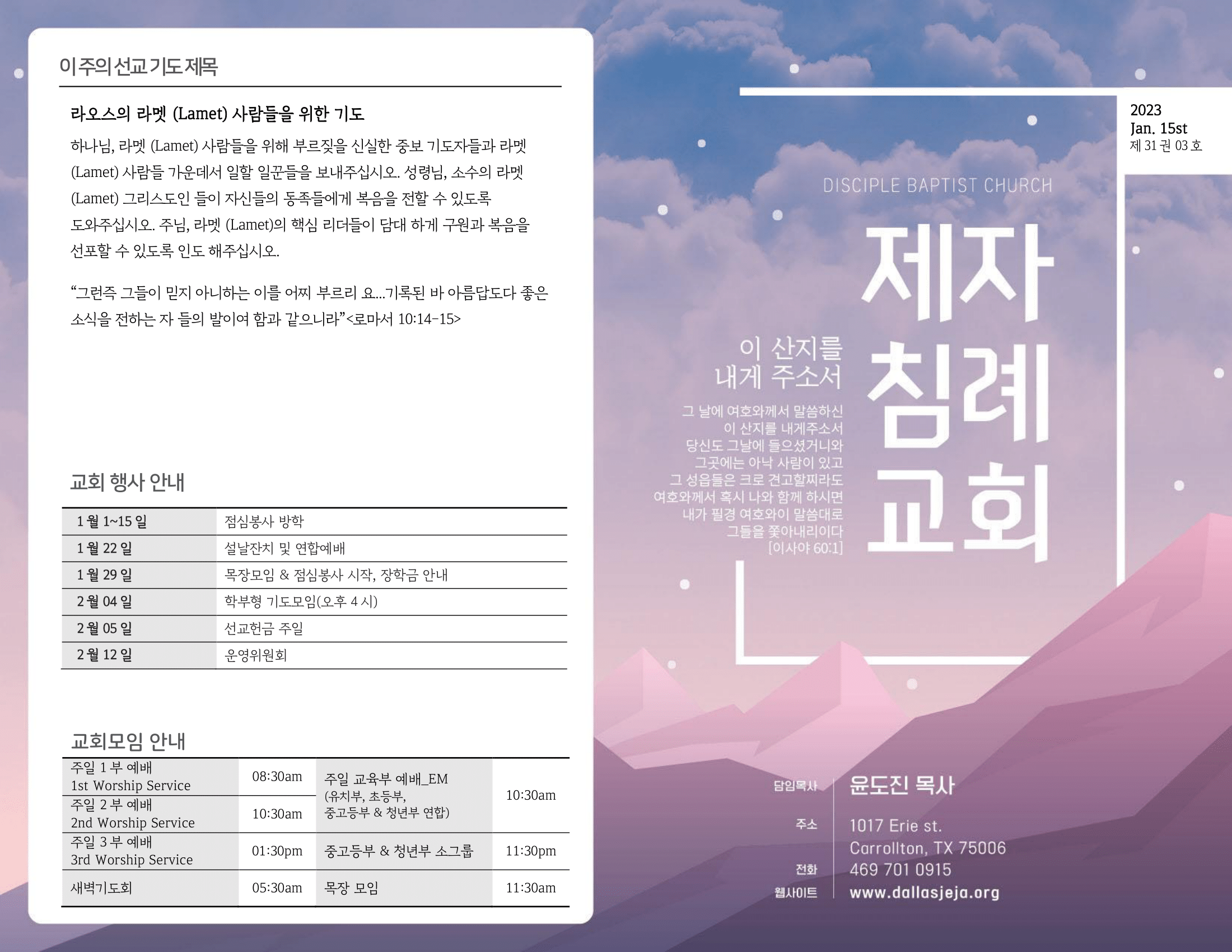 (2023.1.15) 주일예배 주보 페이지 정보 작성자 달라스제자침례교회 댓글 0건 조회 640회 작성일 23-01-14 17:08 목록 본문 (2023.1.15) 주일예배 주보 이전글(2023.1.22) 주일예배 주보 23.01.21 다음글(2023.1.8) 주일예배 주보 23.01.07
