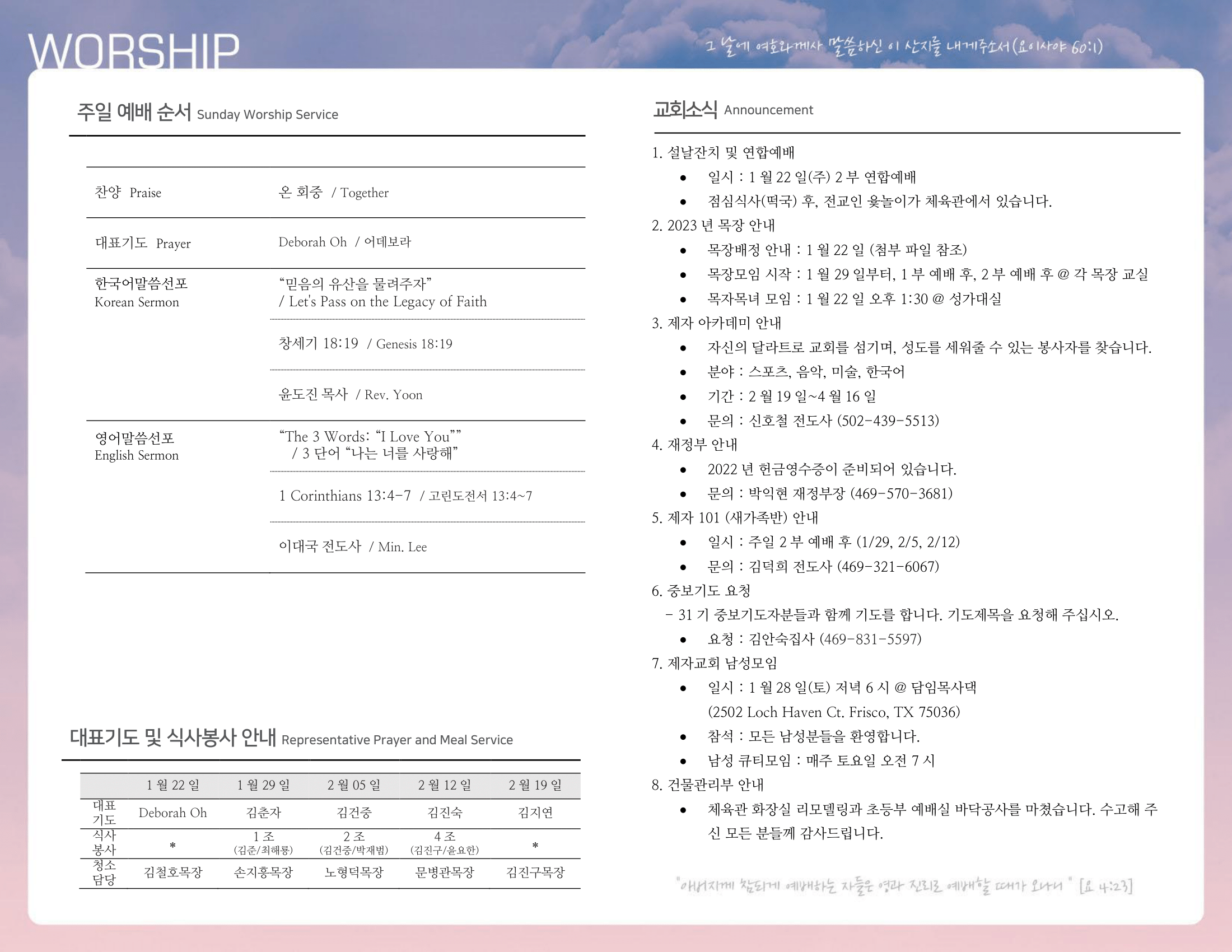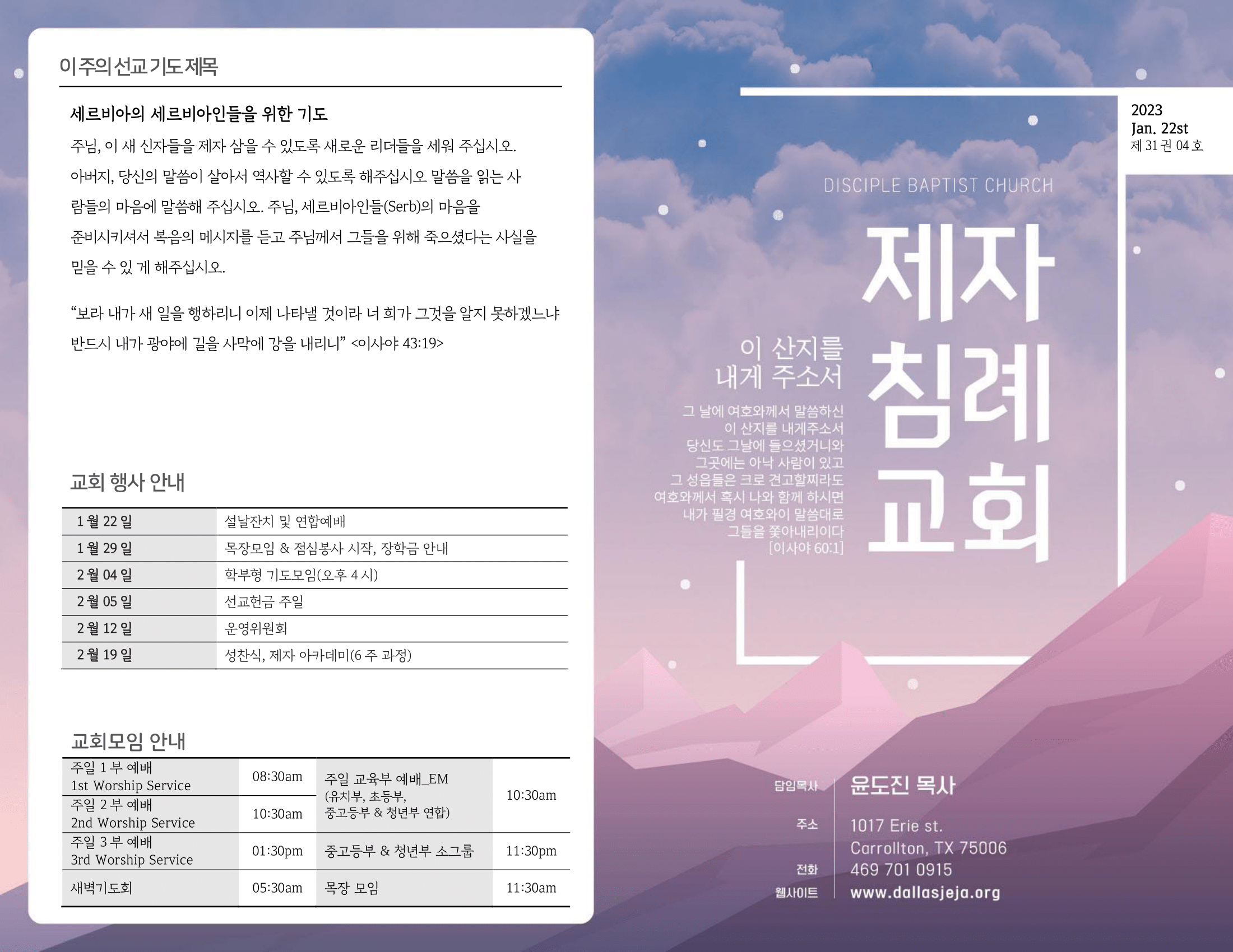 (2023.1.22) 주일예배 주보 페이지 정보 작성자 달라스제자침례교회 댓글 0건 조회 628회 작성일 23-01-21 14:03 목록 본문 (2023.1.22) 주일예배 주보 이전글(2023.1.29) 주일예배 주보 23.01.28 다음글(2023.1.15) 주일예배 주보 23.01.14