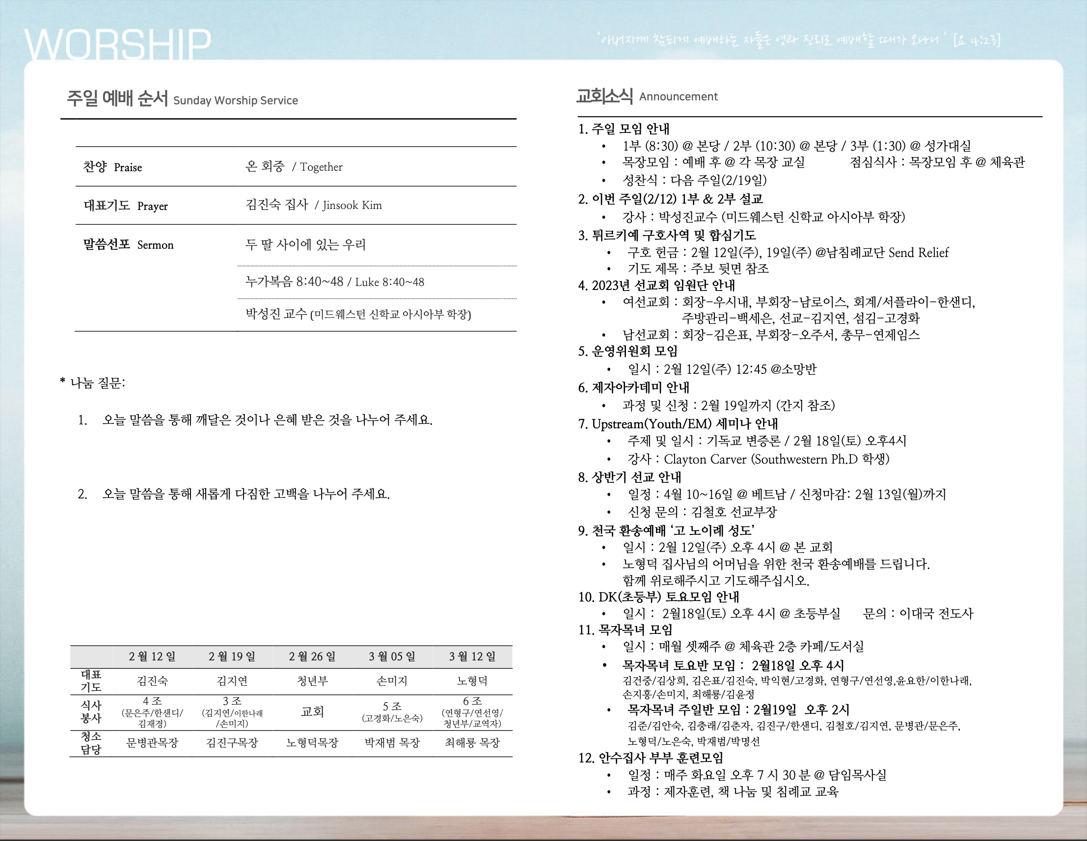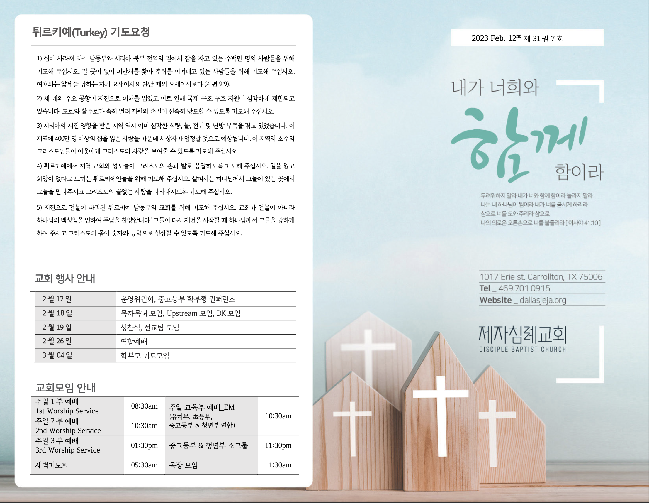(2023.2.12) 주일예배 주보 페이지 정보 작성자 달라스제자침례교회 댓글 0건 조회 439회 작성일 23-02-10 19:02 목록 본문 - 이전글(2023.2.19) 주일예배 주보 23.02.18 다음글(2023.2.05) 주일예배 주보 23.02.04