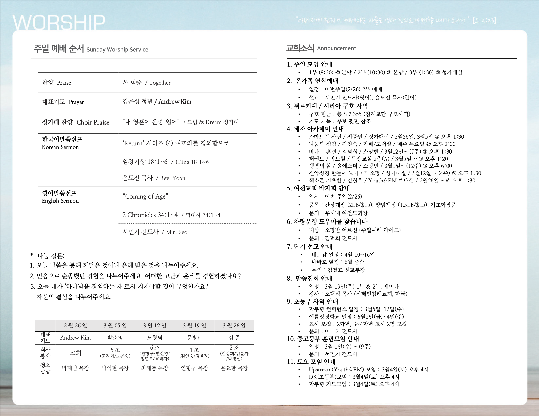 (2023.2.26) 주일예배 주보 페이지 정보 작성자 달라스제자침례교회 댓글 0건 조회 431회 작성일 23-02-24 23:02 목록 본문 - 이전글(2023.3.05) 주일예배 주보 23.03.04 다음글(2023.2.19) 주일예배 주보 23.02.18