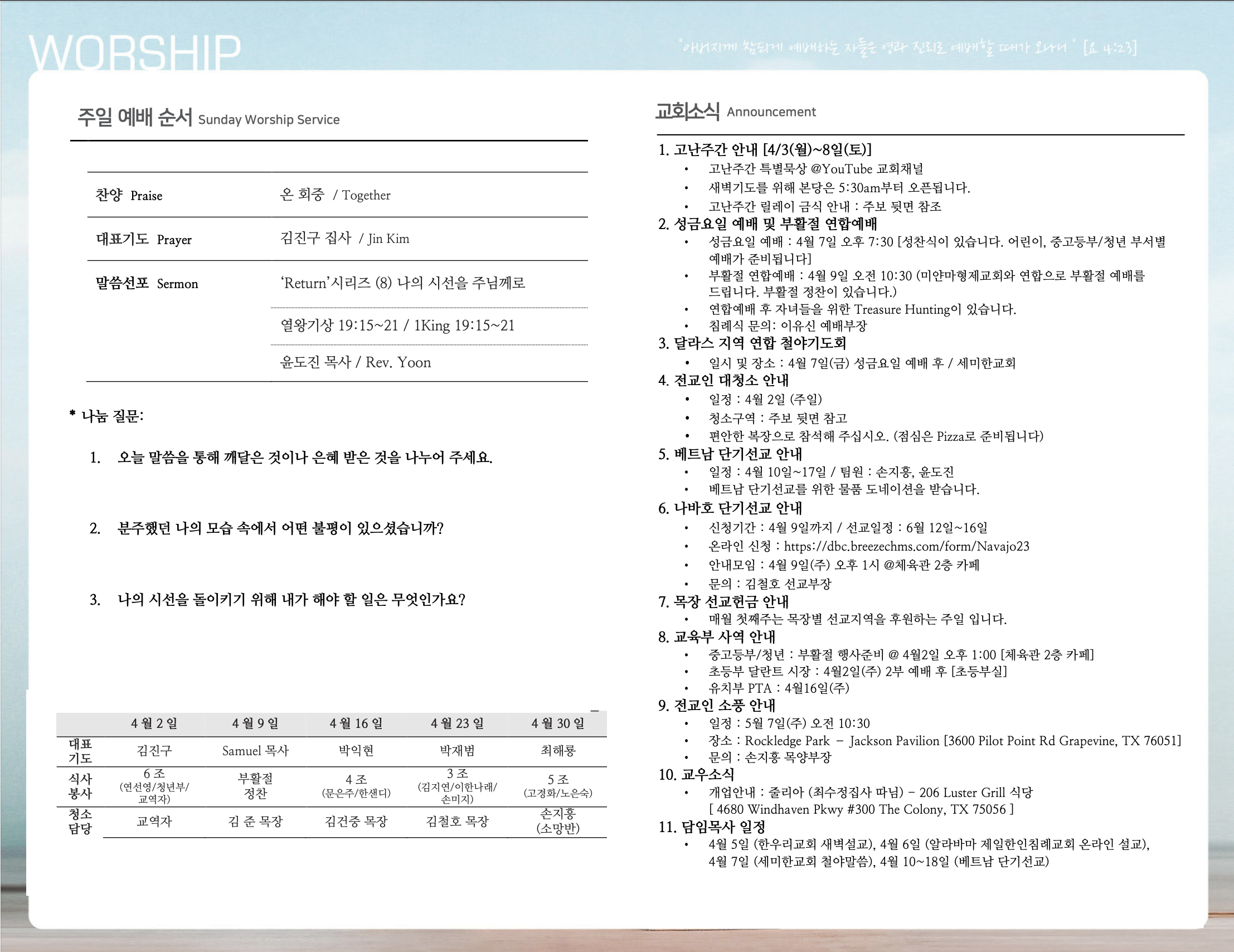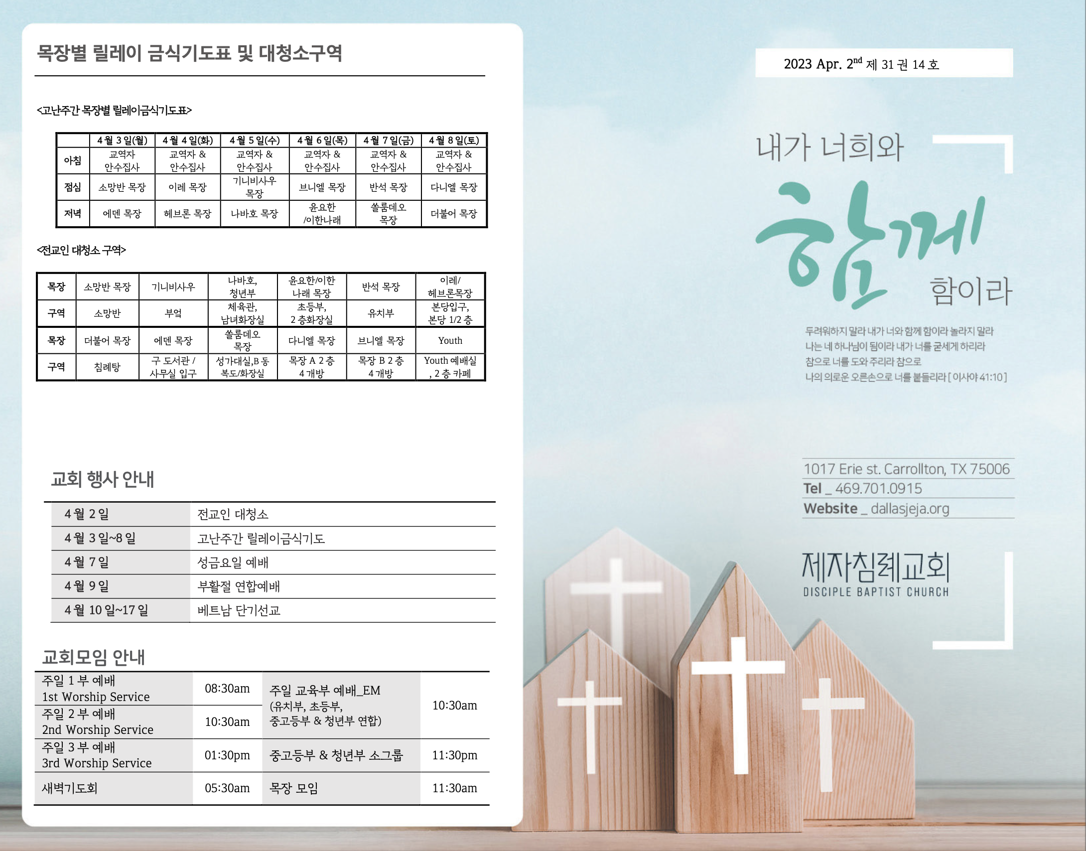 (2023.04.02) 주일예배 주보 페이지 정보 작성자 달라스제자침례교회 댓글 0건 조회 431회 작성일 23-04-01 13:01 목록 본문 - 이전글(2023.04.09) 주일예배 주보 23.04.08 다음글(2023.3.26) 주일 주보 23.03.25