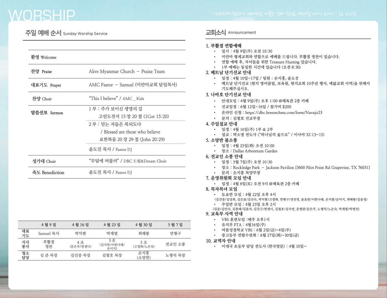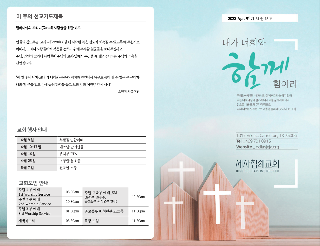 (2023.04.09) 주일예배 주보 페이지 정보 작성자 달라스제자침례교회 댓글 0건 조회 404회 작성일 23-04-08 16:55 목록 본문 - 이전글(2023.04.16) 주일예배 주보 23.04.14 다음글(2023.04.02) 주일예배 주보 23.04.01