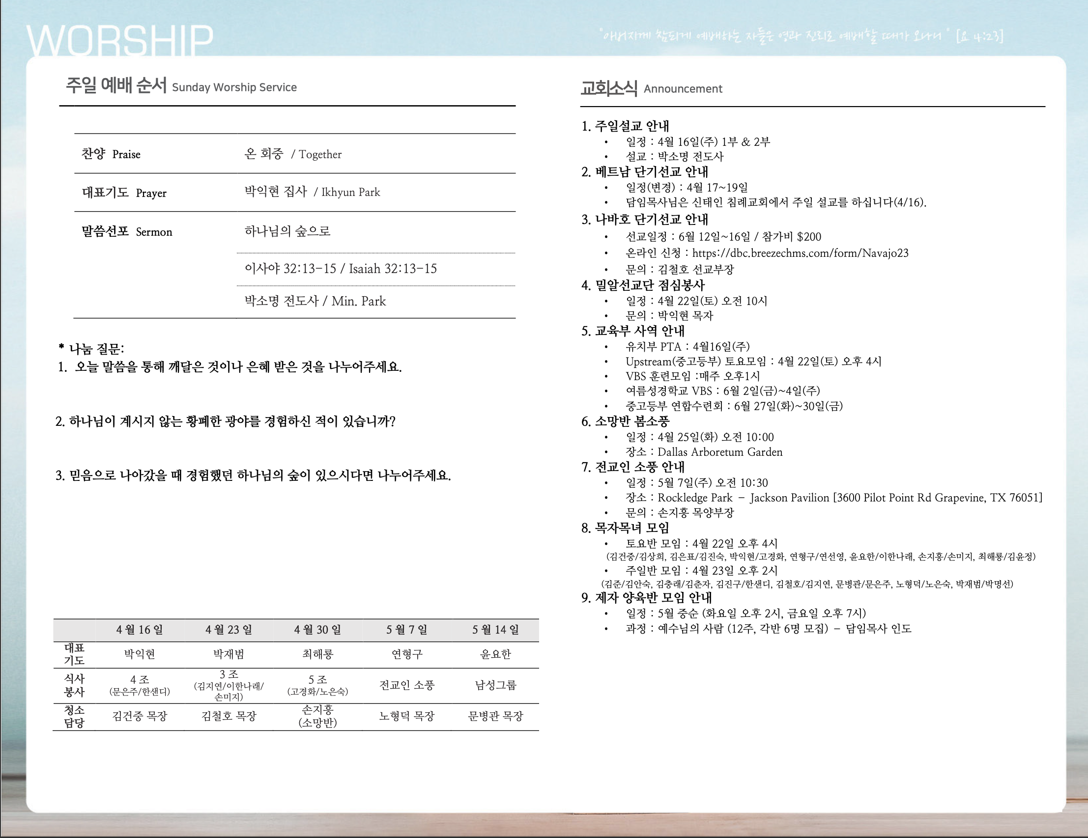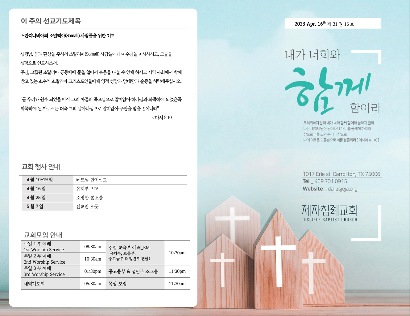 (2023.04.16) 주일예배 주보 페이지 정보 작성자 달라스제자침례교회 댓글 0건 조회 425회 작성일 23-04-14 22:08 목록 본문 - 이전글(2023.04.23) 주일예배 주보 23.04.22 다음글(2023.04.09) 주일예배 주보 23.04.08