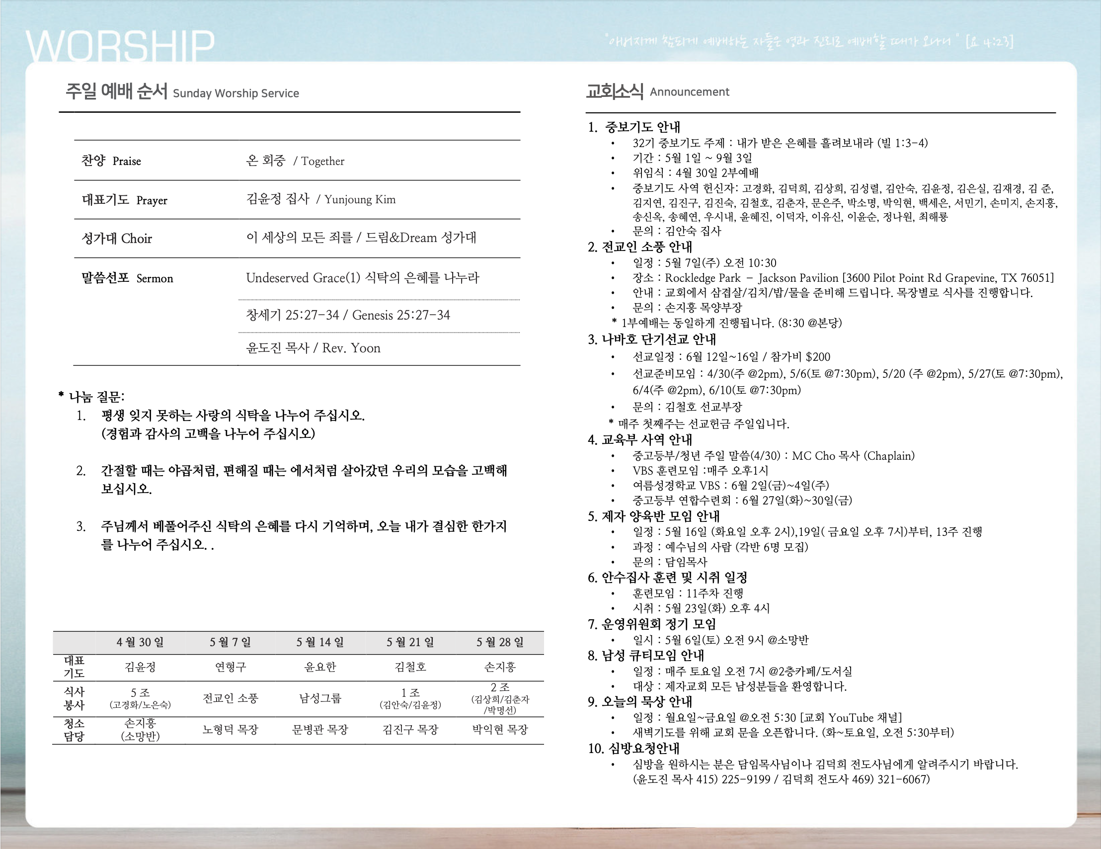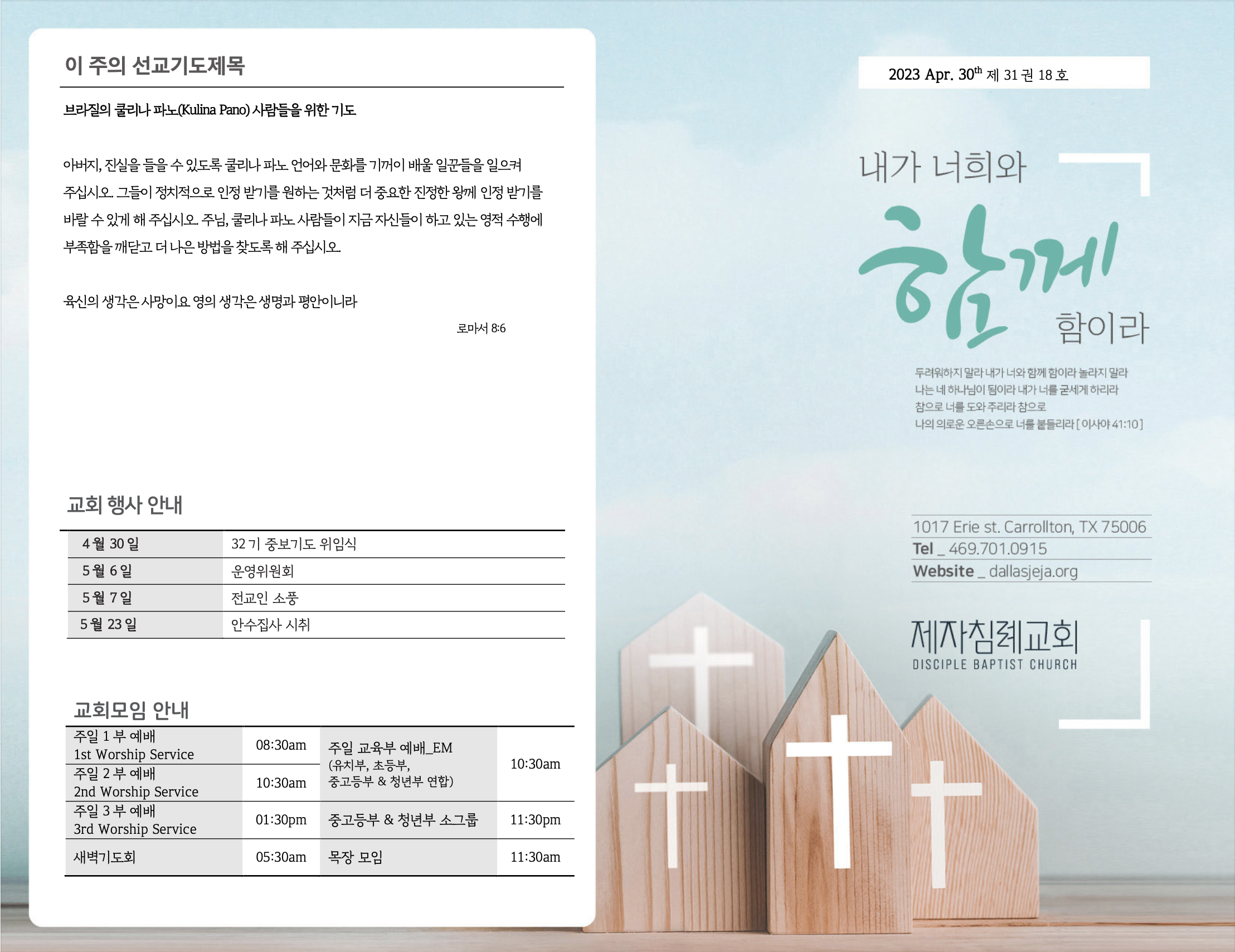 (2023.04.30)주일예배 주보 페이지 정보 작성자 달라스제자침례교회 댓글 0건 조회 415회 작성일 23-04-29 16:01 목록 본문 - 이전글(2023.05.07)주일예배 주보 23.05.06 다음글(2023.04.23) 주일예배 주보 23.04.22