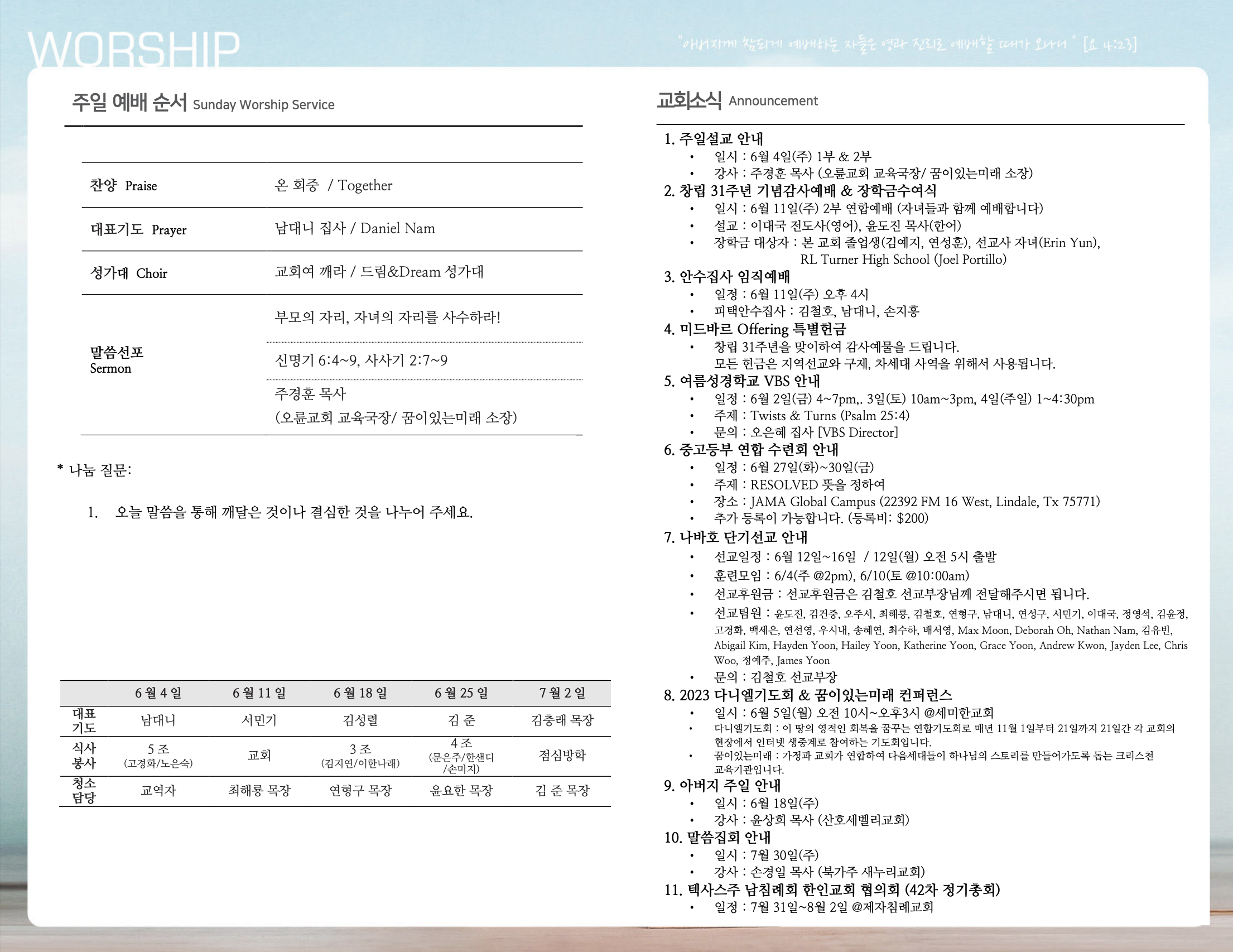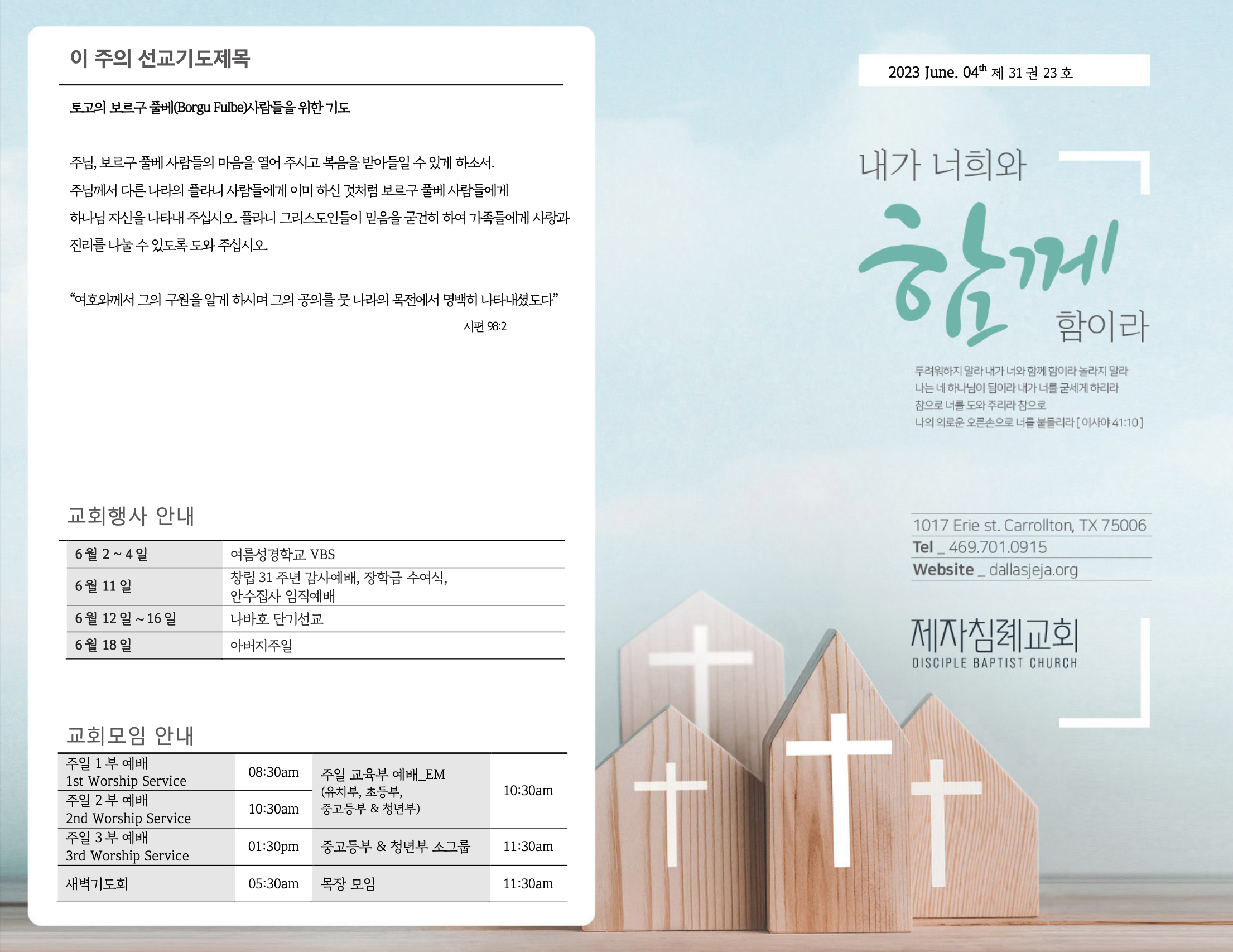 (2023.06.04) 주일예배 주보 페이지 정보 작성자 달라스제자침례교회 댓글 0건 조회 401회 작성일 23-06-03 10:38 목록 본문 - 이전글(2023.06.11) 주일예배 주보 23.06.10 다음글(2023.05.28) 주일예배 주보 23.05.27