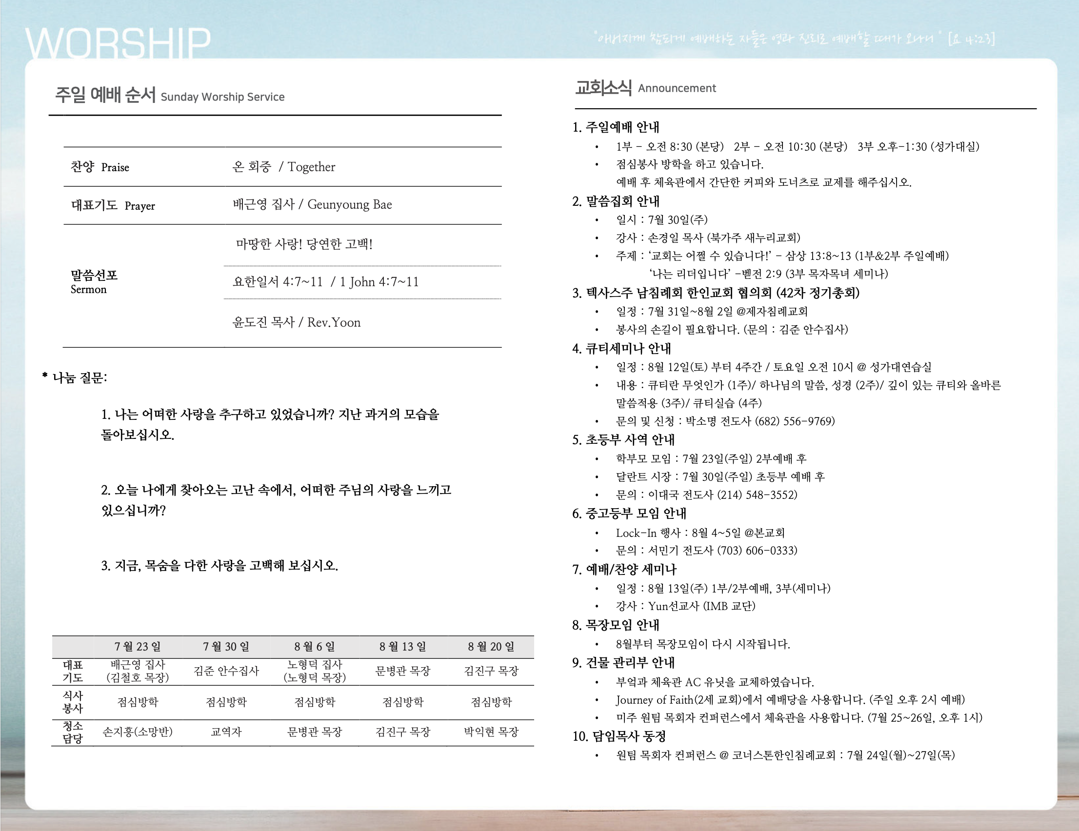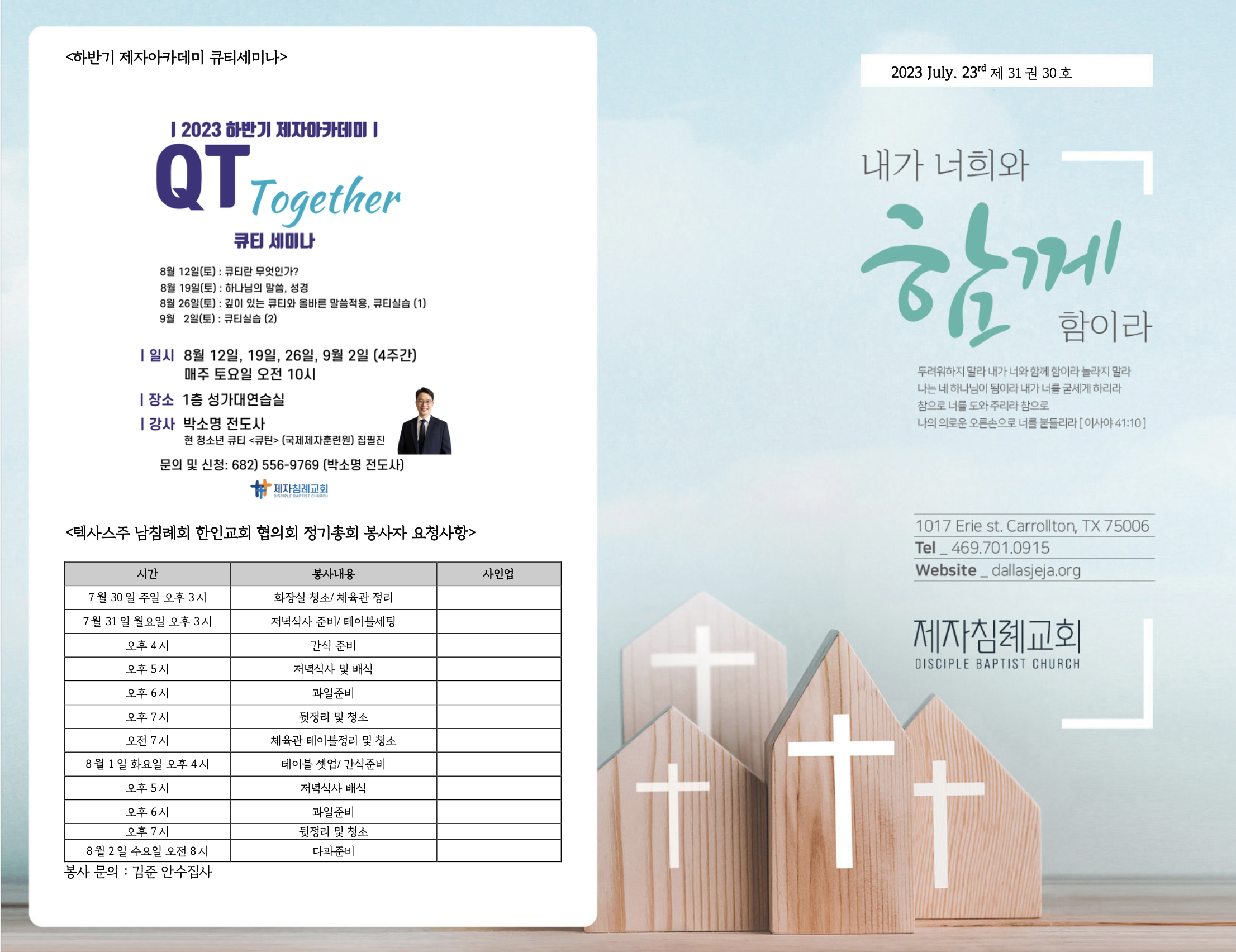 (2023.07.23) 주일예배 주보 페이지 정보 작성자 달라스제자침례교회 댓글 0건 조회 377회 작성일 23-07-22 11:57 목록 본문 - 이전글(2023.07.30) 주일예배 주보 23.07.29 다음글(2023.07.16) 주일예배 주보 23.07.15