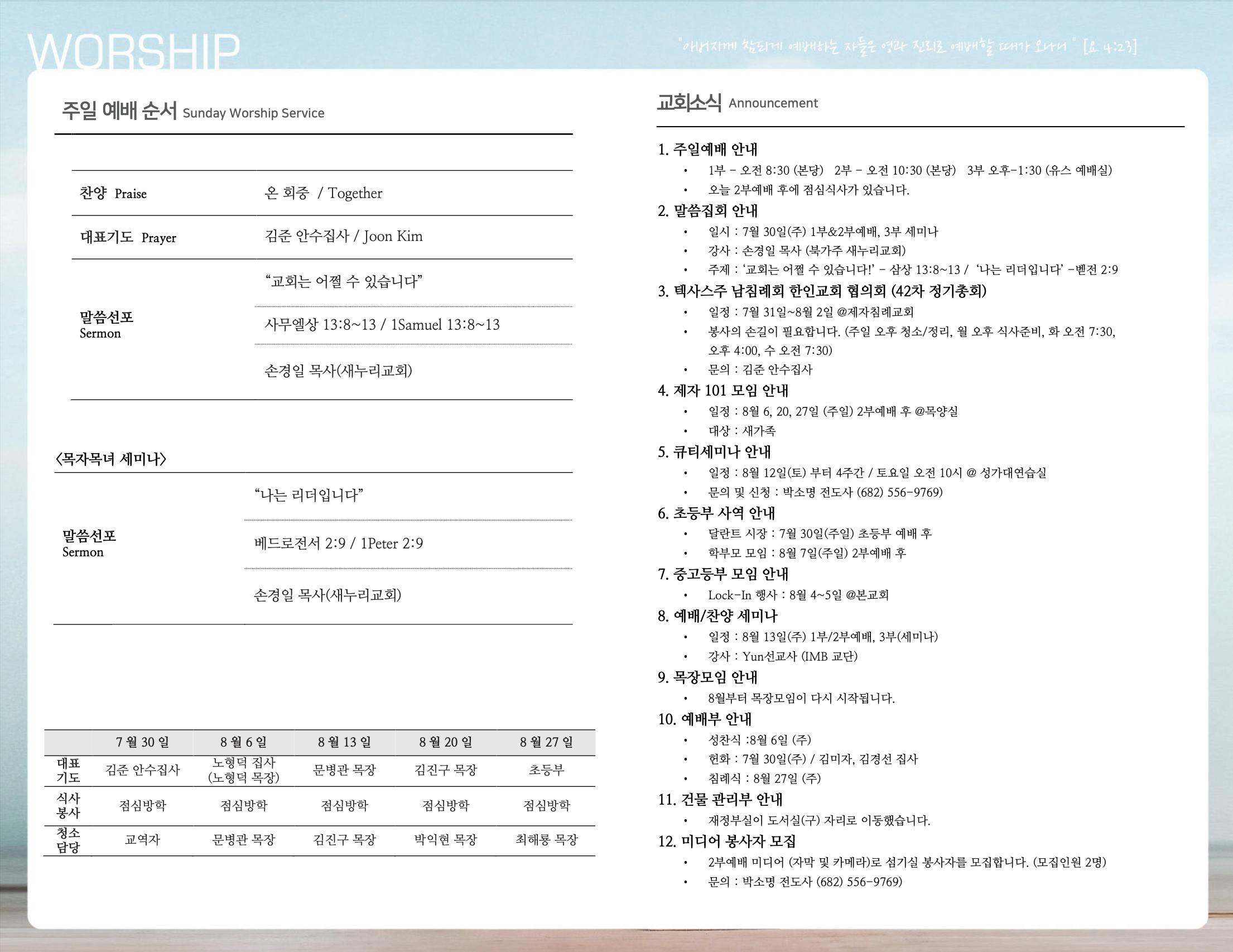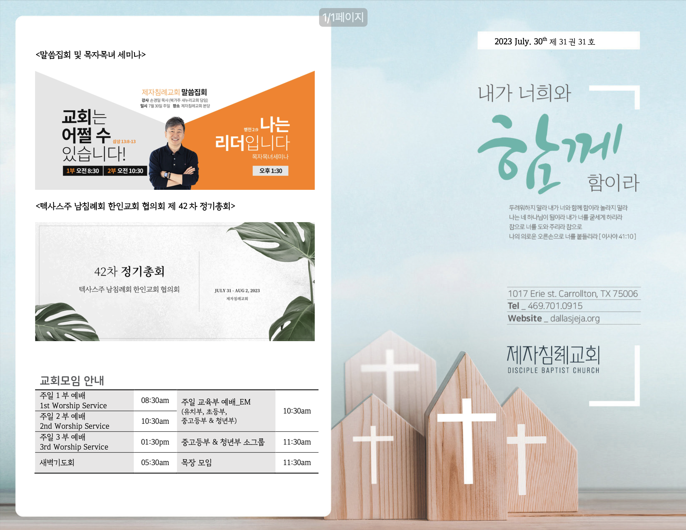 (2023.07.30) 주일예배 주보 페이지 정보 작성자 달라스제자침례교회 댓글 0건 조회 370회 작성일 23-07-29 13:20 목록 본문 - 이전글(2023.08.06) 주일예배 주보 23.08.05 다음글(2023.07.23) 주일예배 주보 23.07.22