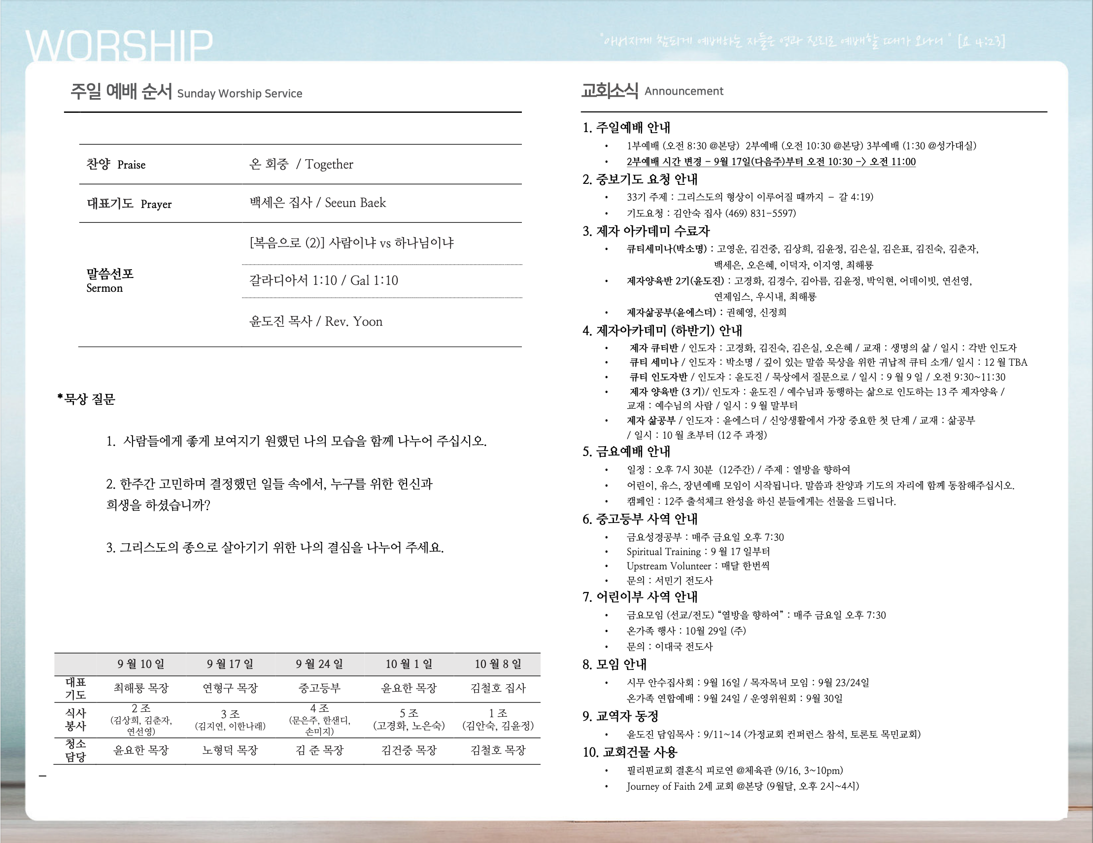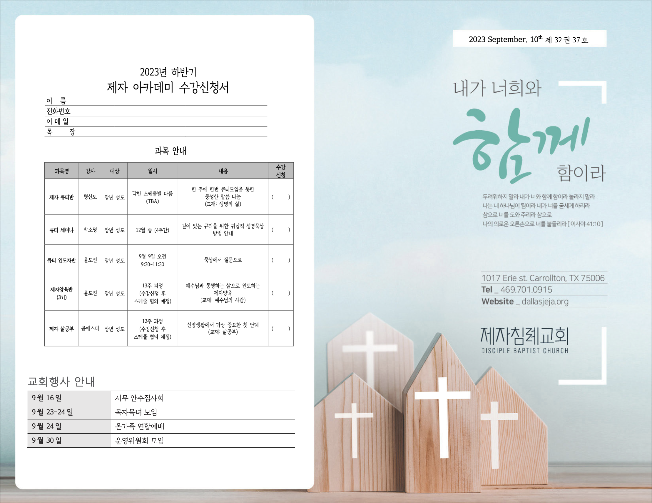 (2023.09.10) 주일예배 주보 페이지 정보 작성자 달라스제자침례교회 댓글 0건 조회 333회 작성일 23-09-09 07:31 목록 본문 - 이전글(2023.09.17) 주일예배 주보 23.09.16 다음글(2023.09.03) 주일예배 주보 23.09.02