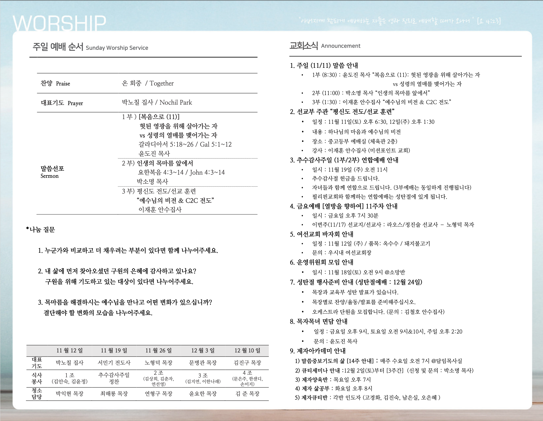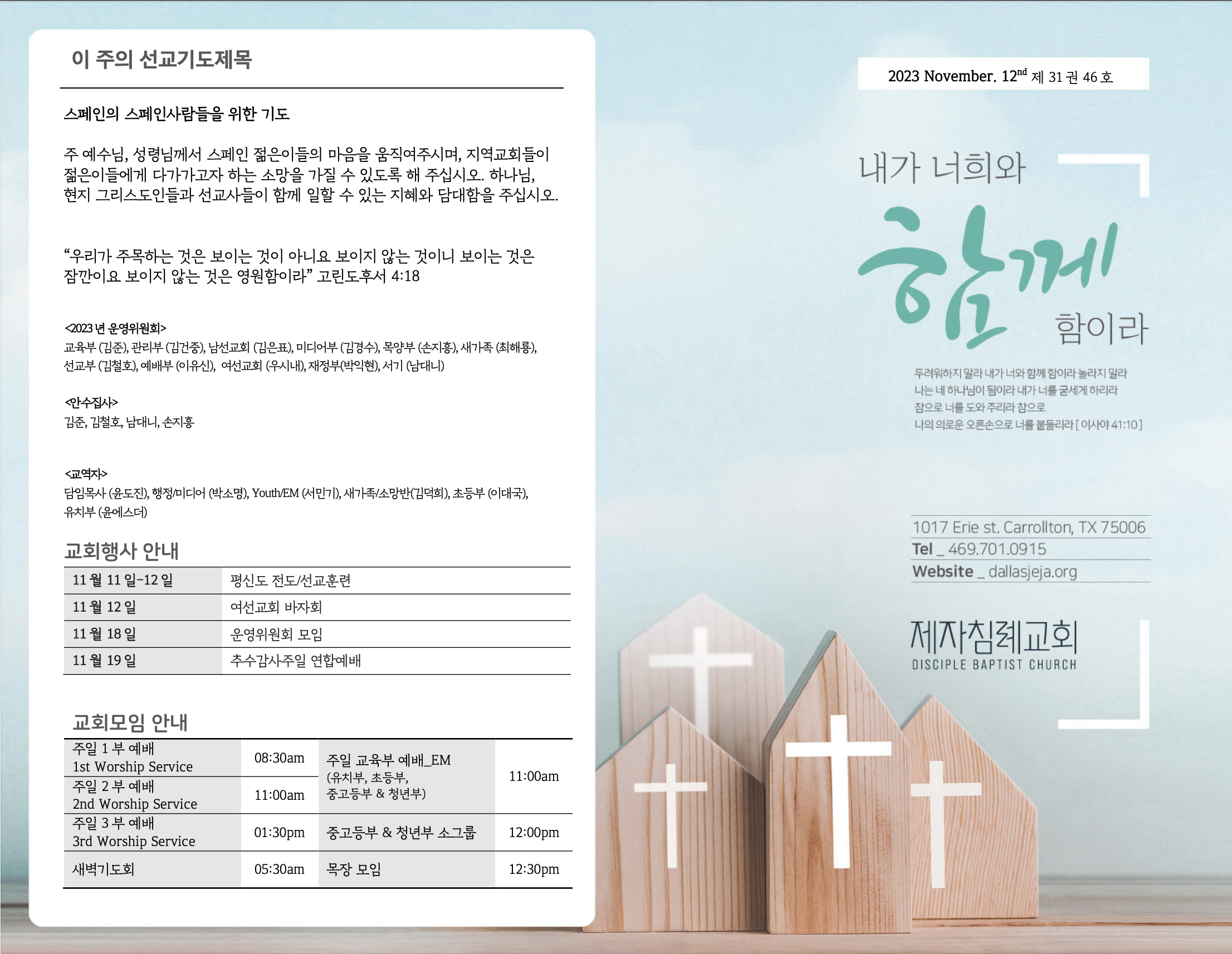 (2023.11.12) 주일예배 주보 페이지 정보 작성자 달라스제자침례교회 댓글 0건 조회 296회 작성일 23-11-11 15:40 목록 본문 - 이전글(2023.11.19) 주일예배 주보 23.11.18 다음글(2023.11.05) 주일예배 주보 23.11.04