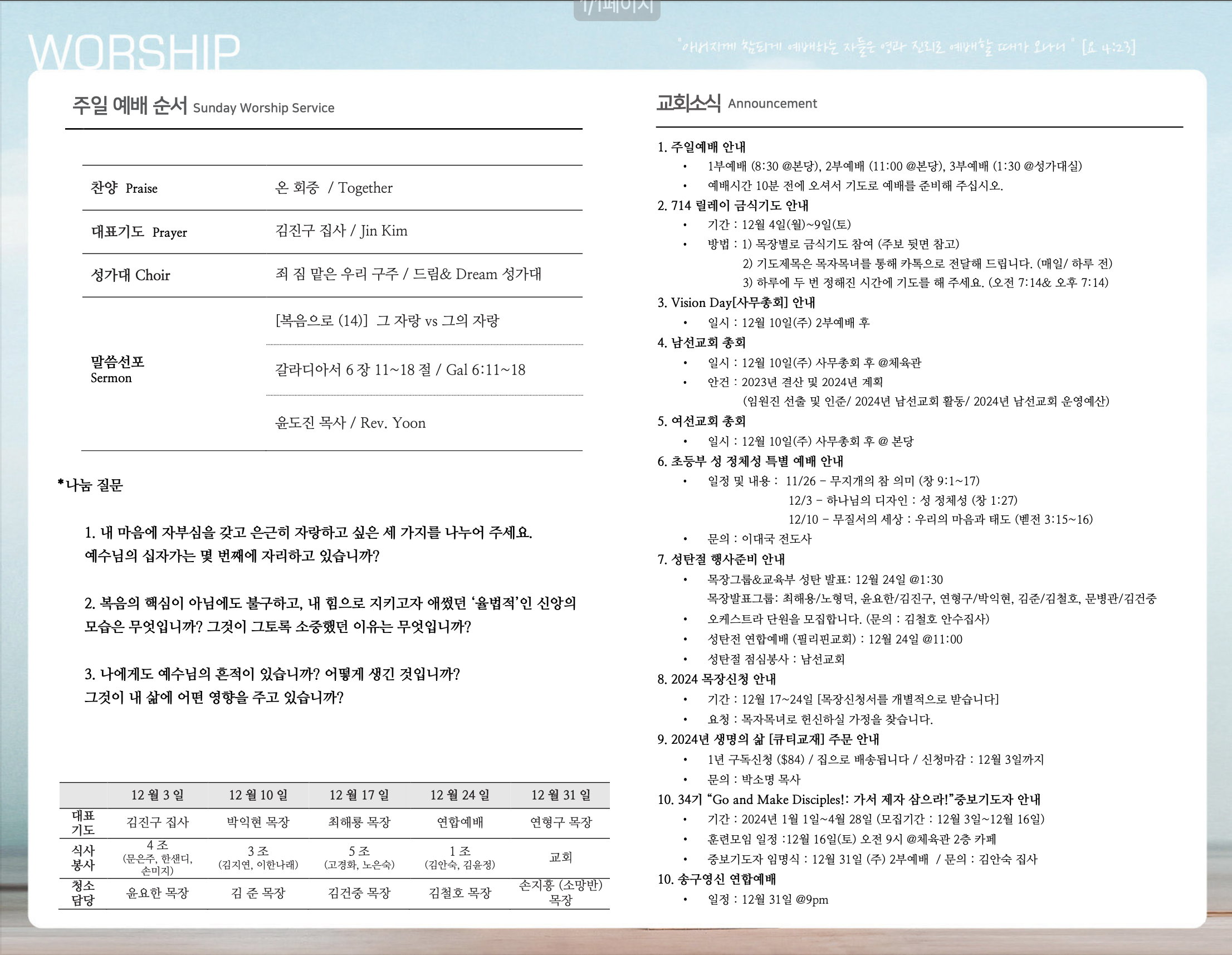 (2023.12.03) 주일 주보 페이지 정보 작성자 달라스제자침례교회 댓글 0건 조회 372회 작성일 23-12-02 15:25 목록 본문 - 이전글(2023.12.10) 주일 주보 23.12.09 다음글(2023.11.26) 주일예배 주보 23.11.25