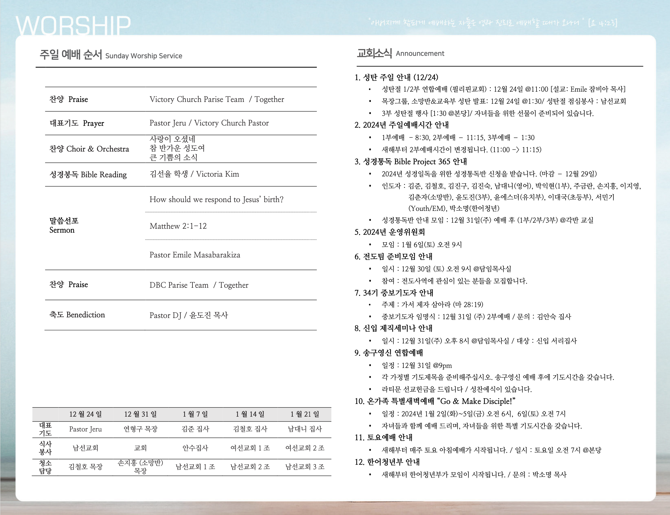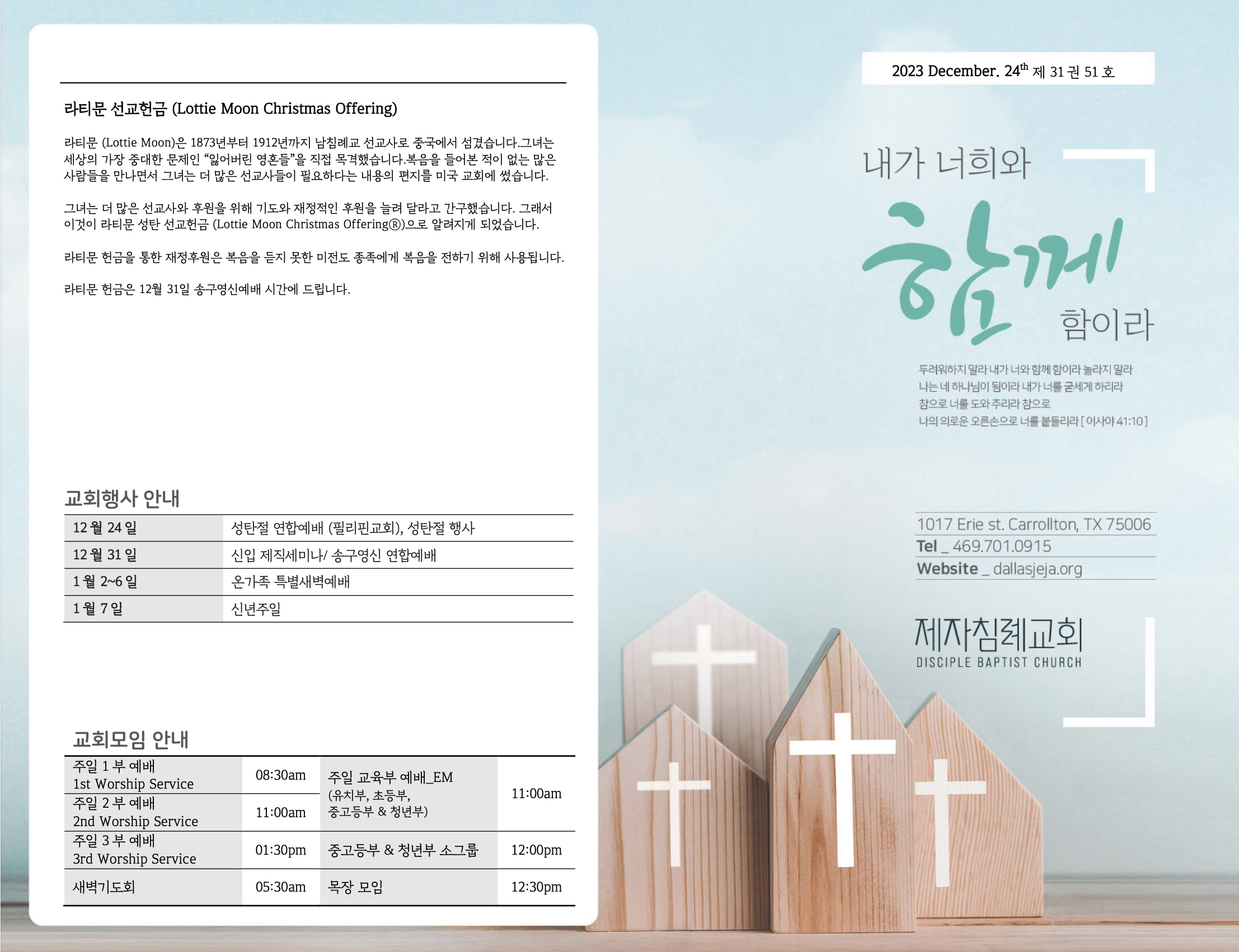 (2023.12.24) 주일 주보 페이지 정보 작성자 달라스제자침례교회 댓글 0건 조회 333회 작성일 23-12-23 22:03 목록 본문 - 이전글(2023.12.31) 주일 주보 23.12.30 다음글(2023.12.10) 주일 주보 23.12.16
