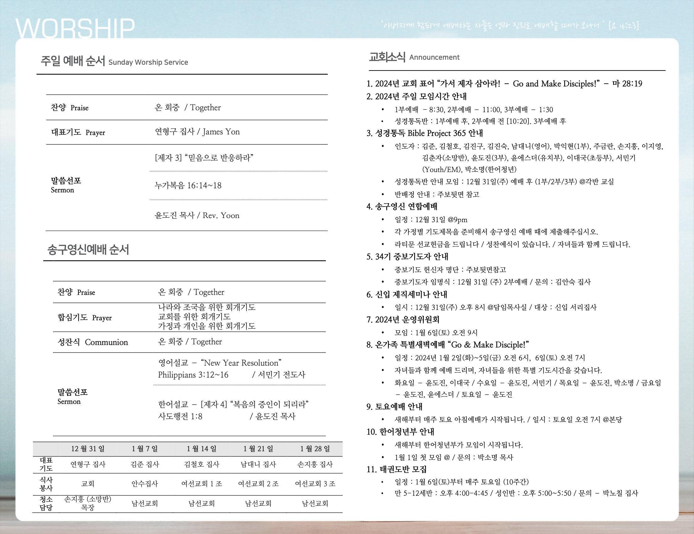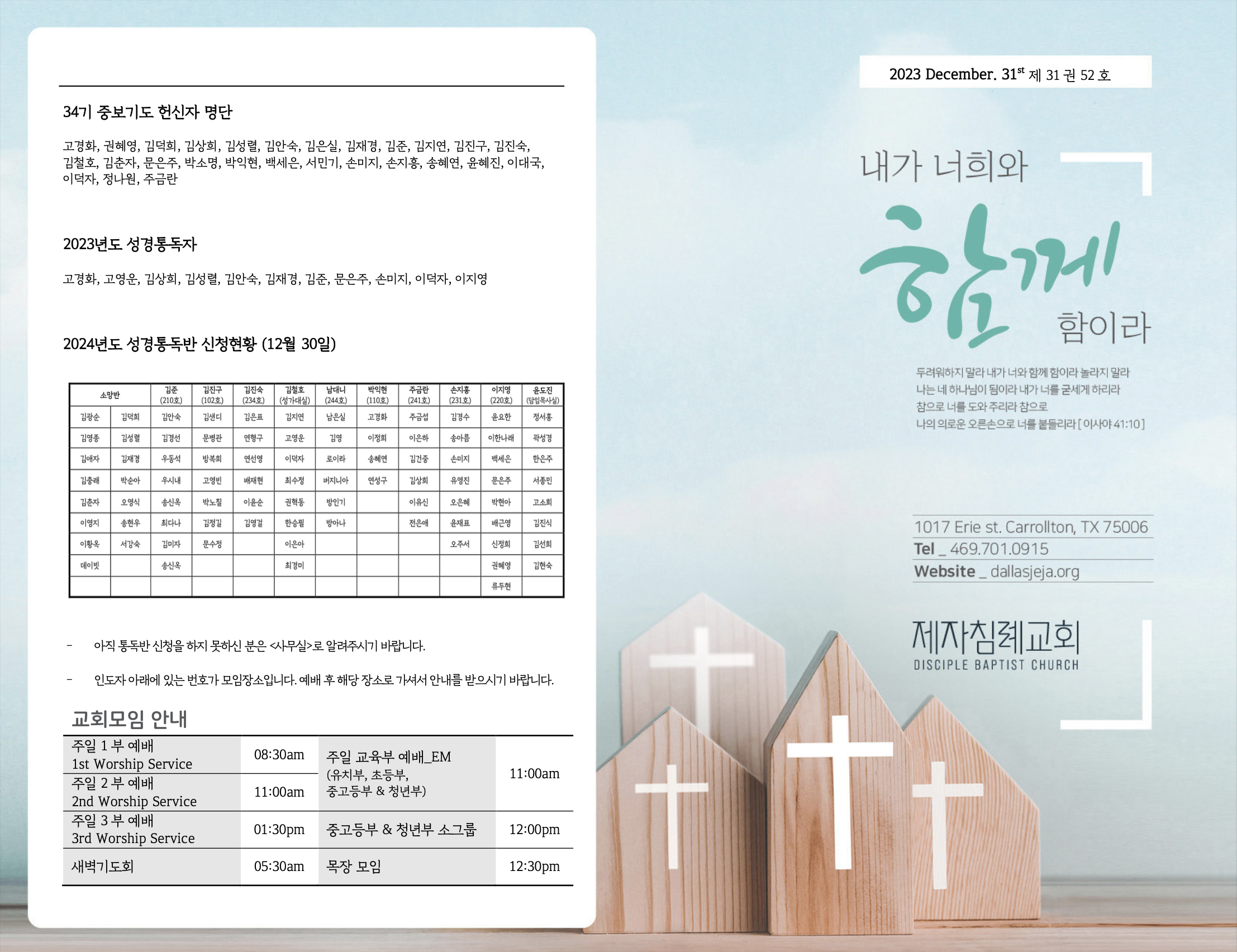 (2023.12.31) 주일 주보 페이지 정보 작성자 달라스제자침례교회 댓글 0건 조회 334회 작성일 23-12-30 21:10 목록 본문 - 이전글(2024.01.07) 주일 주보 24.01.06 다음글(2023.12.24) 주일 주보 23.12.23