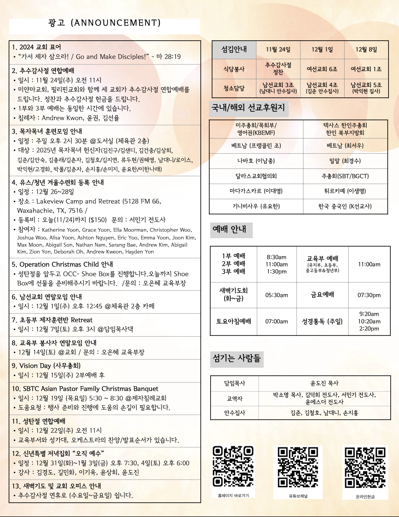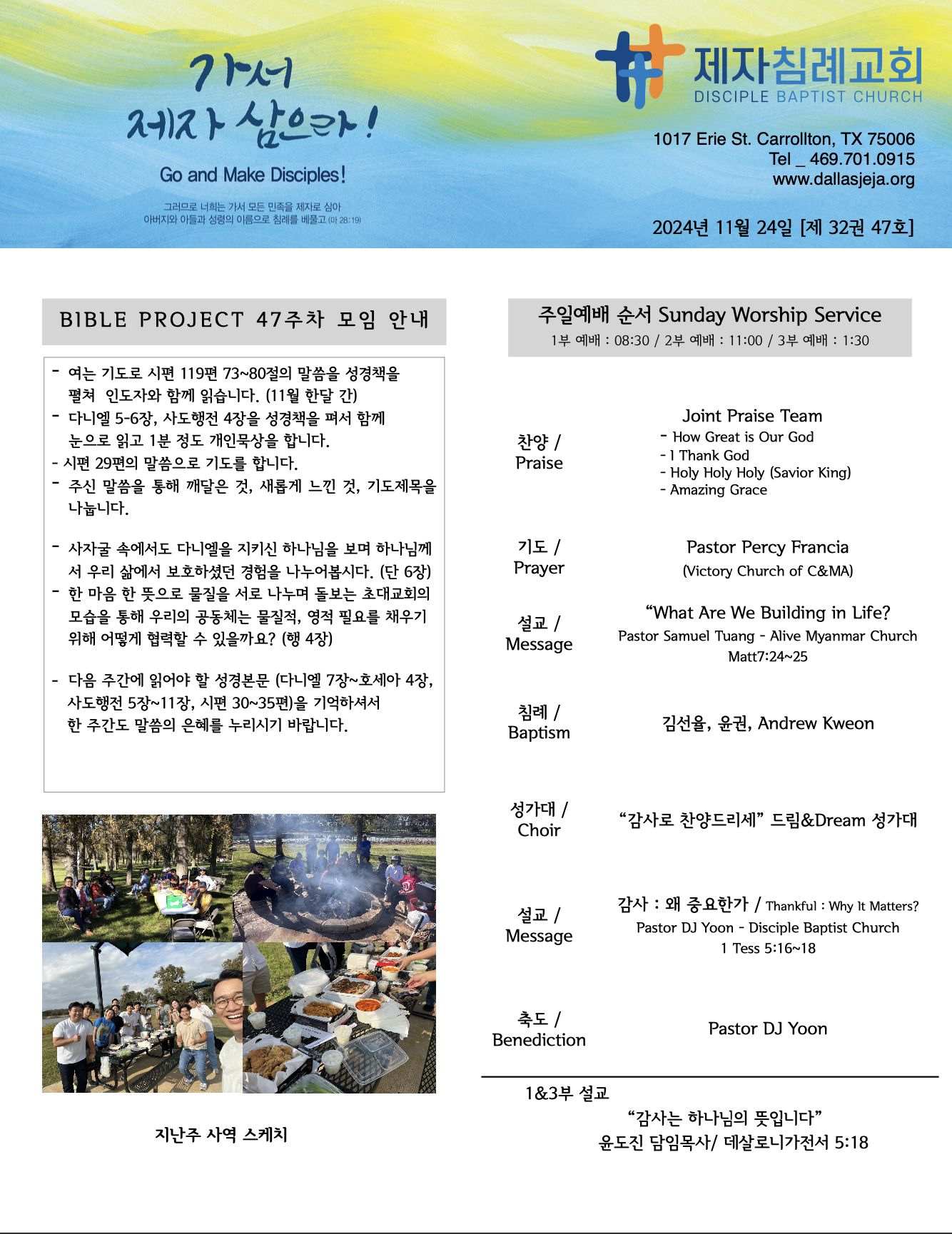 (2024.11.24) 주일 주보 페이지 정보 작성자 달라스제자침례교회 댓글 0건 조회 196회 작성일 24-11-23 12:09 목록 본문 - 이전글(2024.12.01) 주일 주보 24.11.30 다음글(2024.11.17) 주일 주보 24.11.16