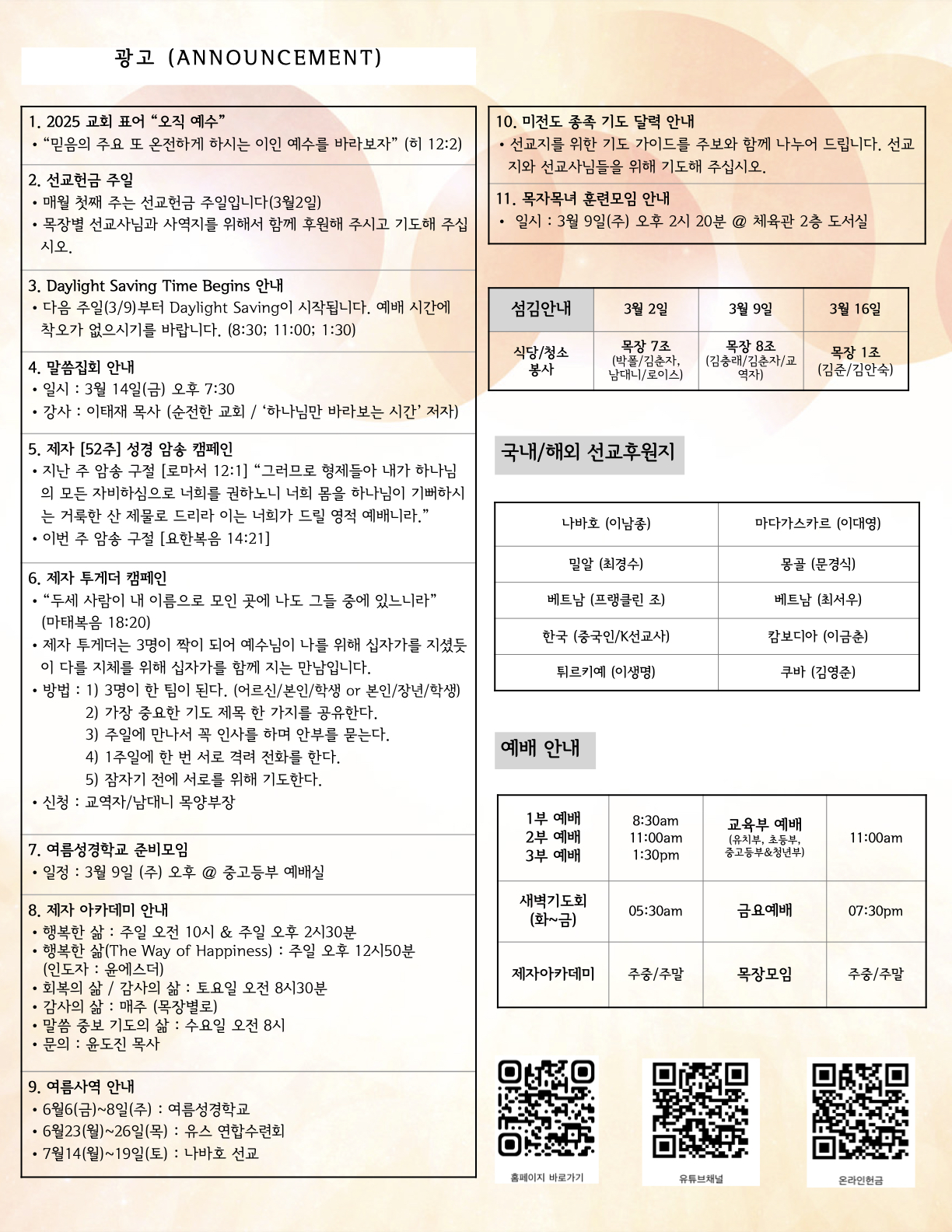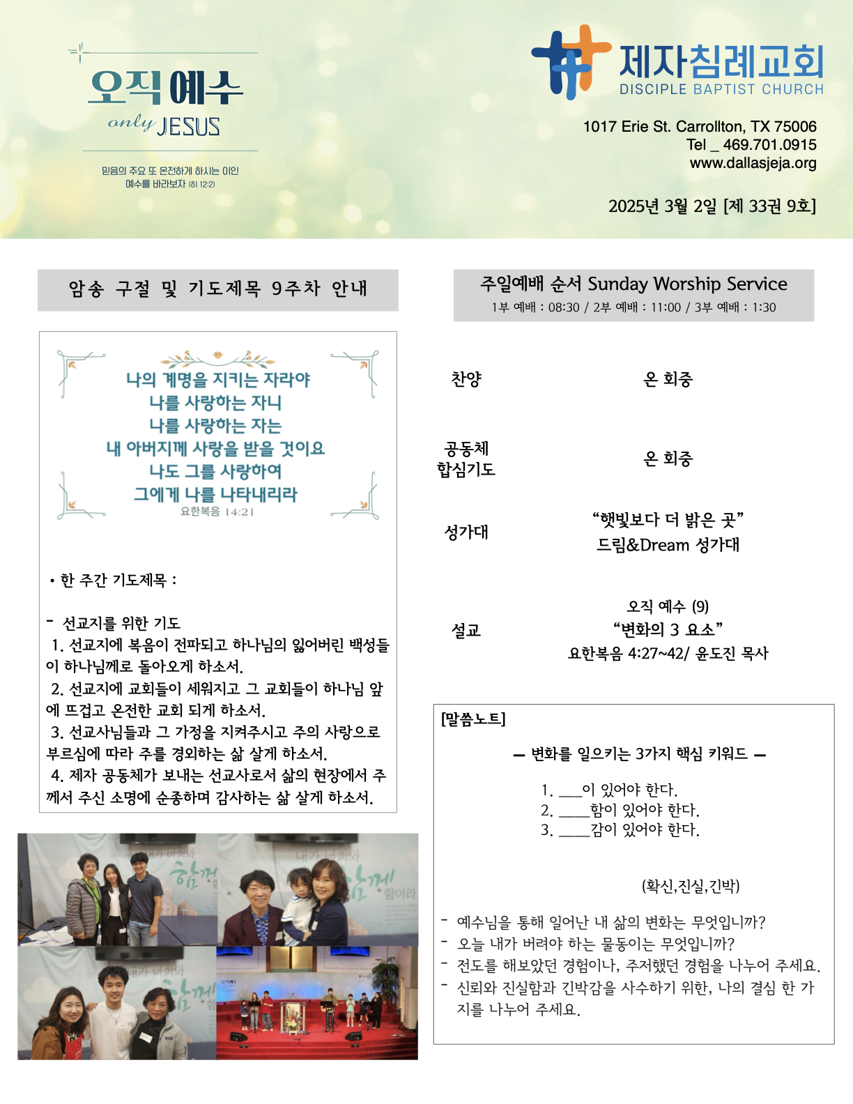 (2025.03.02) 주일 주보 페이지 정보 작성자 달라스제자침례교회 댓글 0건 조회 235회 작성일 25-03-01 12:23 목록 본문 - 이전글(2025.03.09) 주일 주보 25.03.08 다음글(2025.02.23) 주일 주보 25.02.22