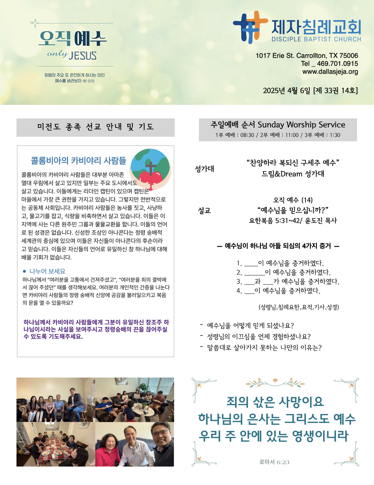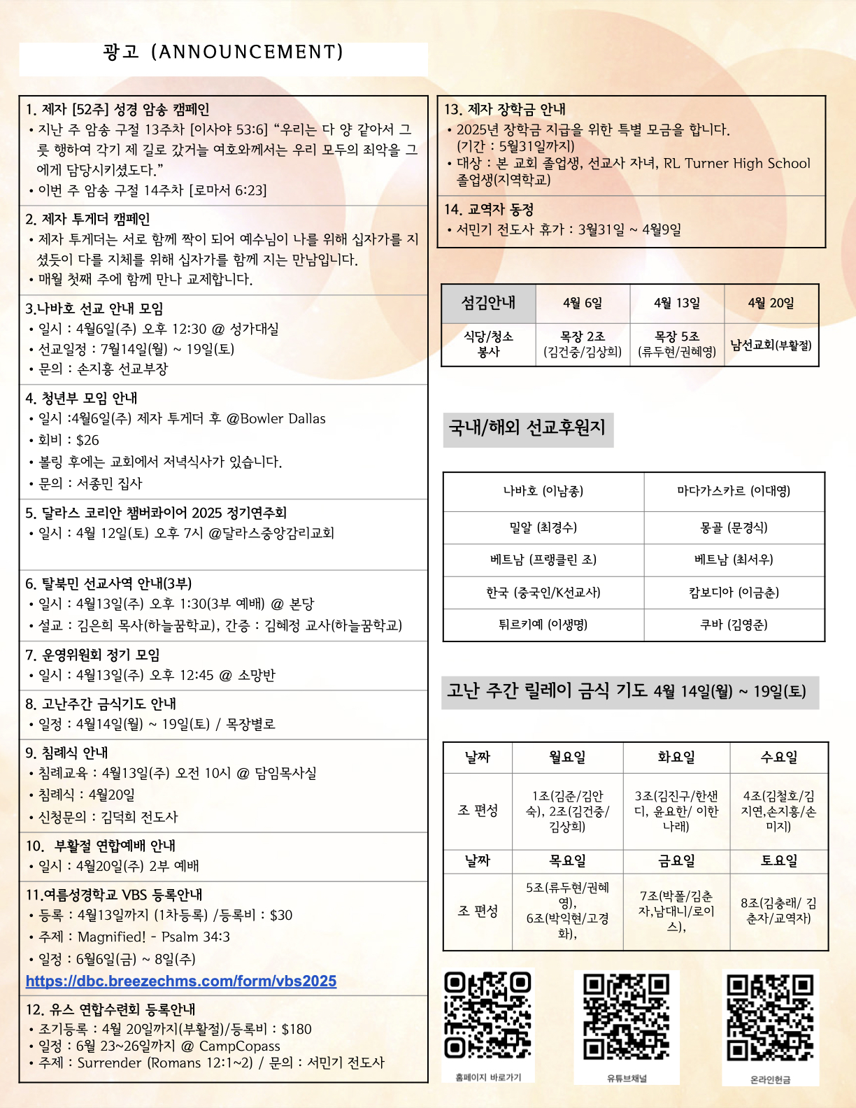 (2025.04.06) 주일 주보 페이지 정보 작성자 달라스제자침례교회 댓글 0건 조회 201회 작성일 25-04-05 10:49 목록 본문 - 이전글(2025.04.13) 주일 주보 25.04.12 다음글(2025.03.30) 주일 주보 25.03.29