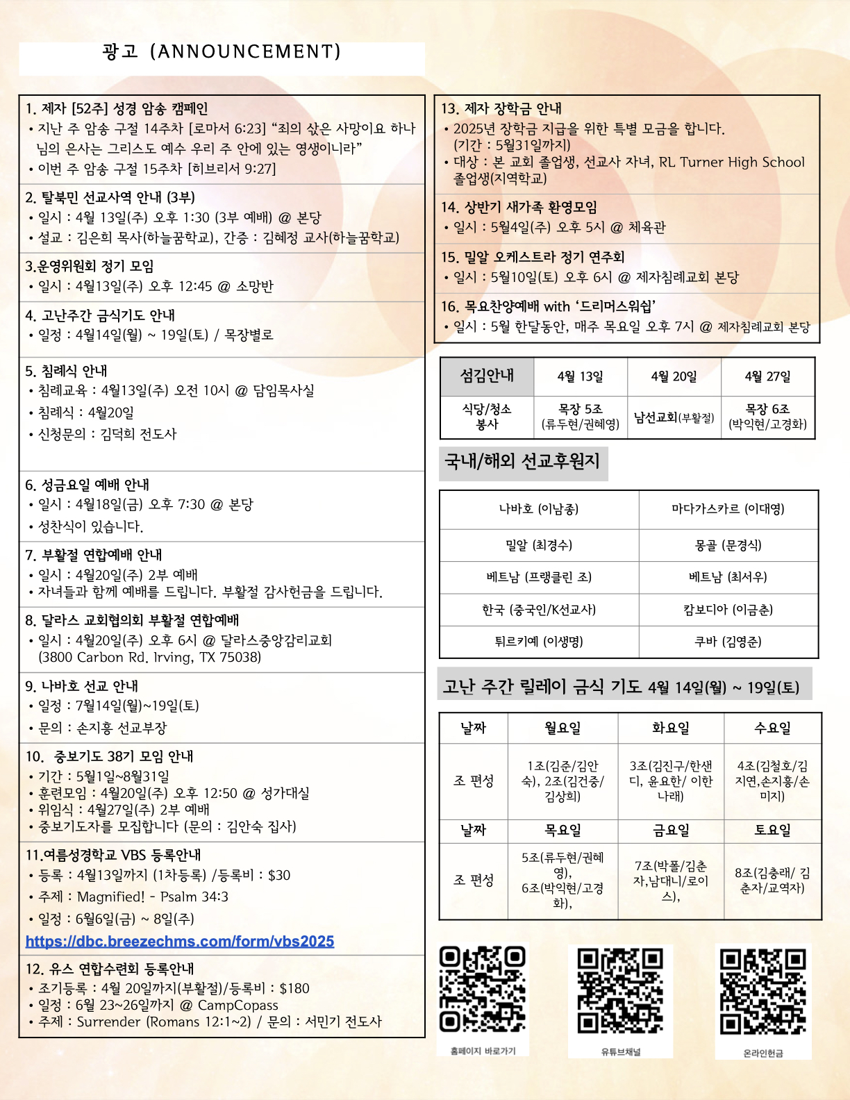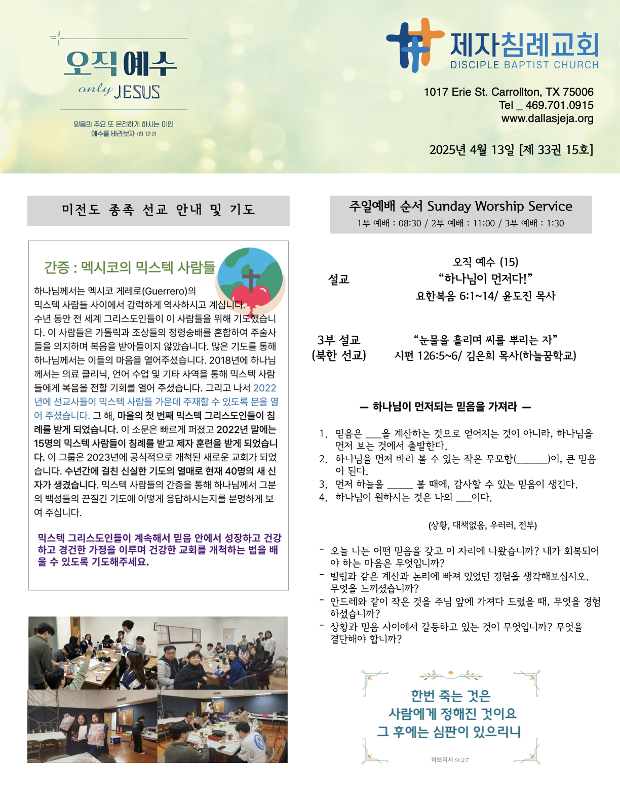 (2025.04.13) 주일 주보 페이지 정보 작성자 달라스제자침례교회 댓글 0건 조회 210회 작성일 25-04-12 10:38 목록 본문 - 이전글(2025.04.20) 주일 주보 25.04.19 다음글(2025.04.06) 주일 주보 25.04.05