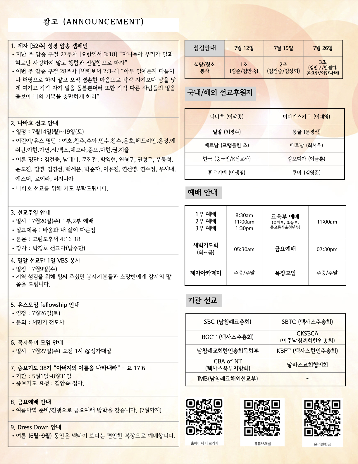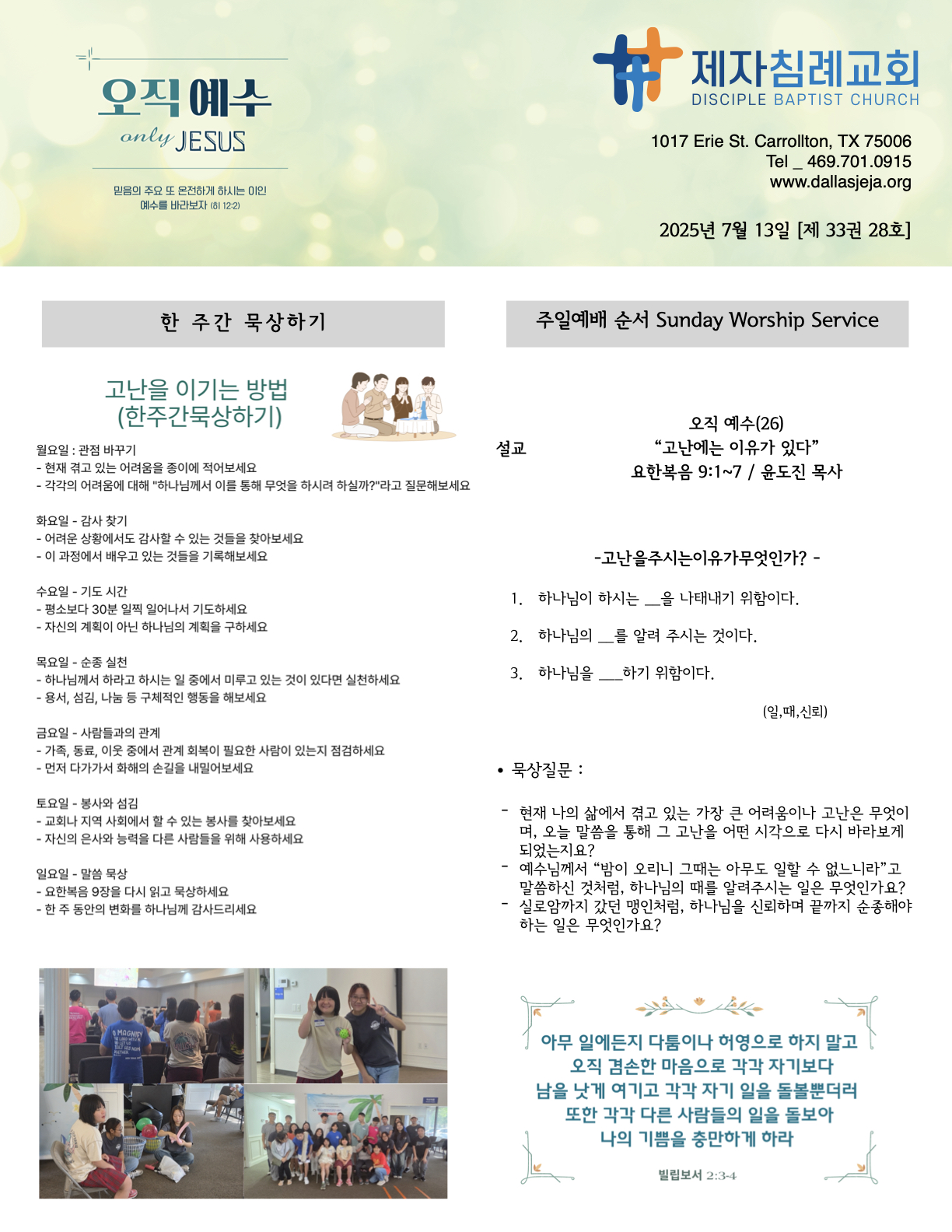 (2025.07.13) 주일 주보 페이지 정보 작성자 달라스제자침례교회 댓글 0건 조회 169회 작성일 25-07-12 14:03 목록 본문 - 이전글(2025.07.20) 주일 주보 25.07.25 다음글(2025.07.06) 주일 주보 25.07.05