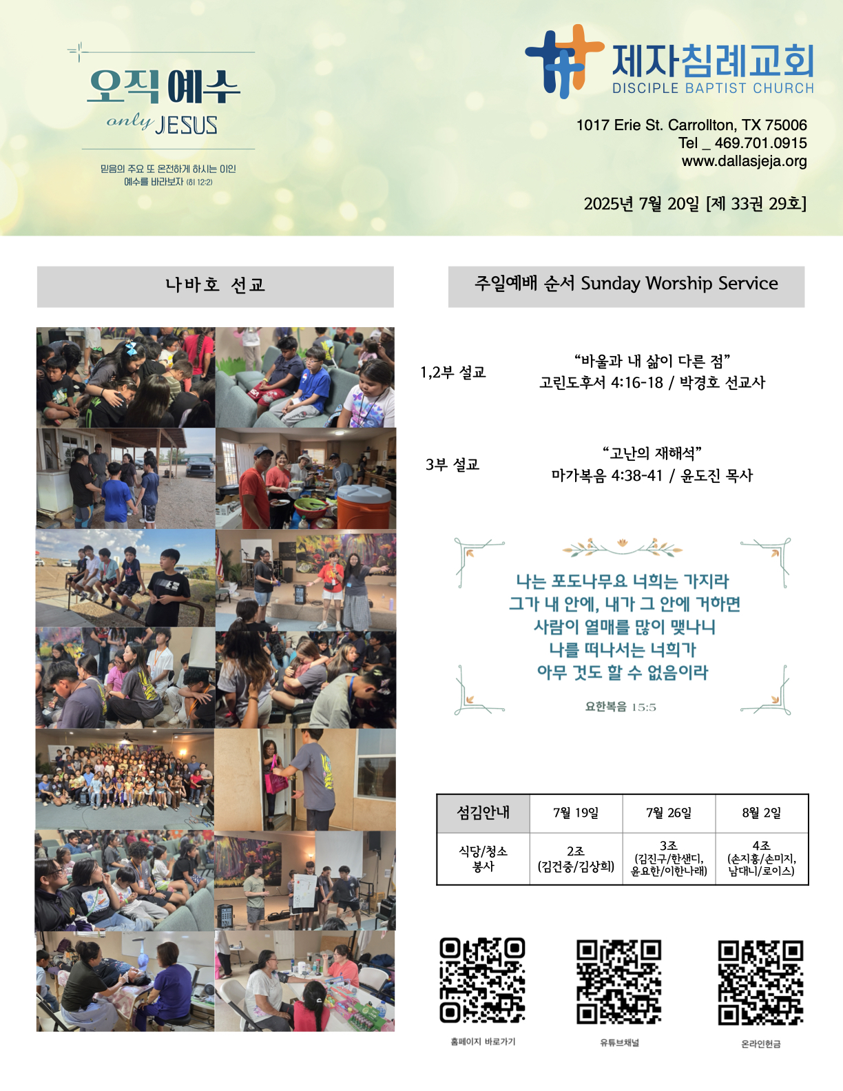 (2025.07.20) 주일 주보 페이지 정보 작성자 달라스제자침례교회 댓글 0건 조회 129회 작성일 25-07-25 20:09 목록 본문 - 이전글(2025.07.27) 주일 주보 25.07.26 다음글(2025.07.13) 주일 주보 25.07.12