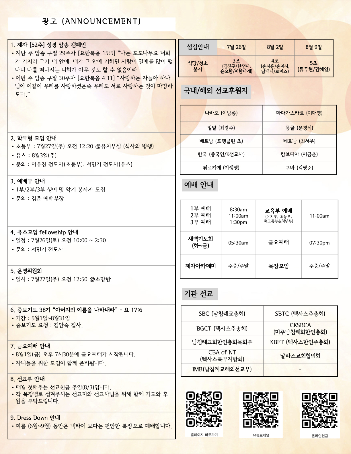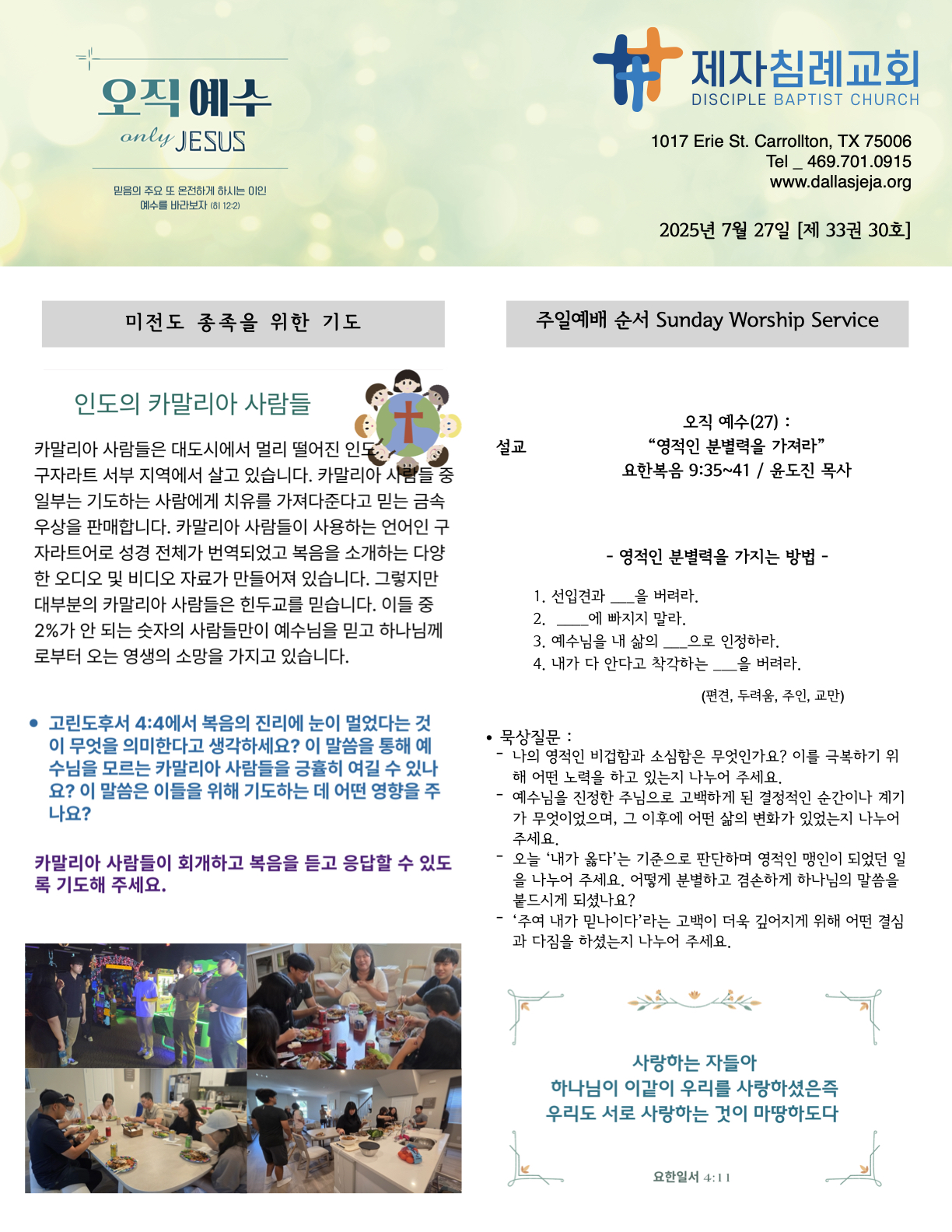 (2025.07.27) 주일 주보 페이지 정보 작성자 달라스제자침례교회 댓글 0건 조회 145회 작성일 25-07-26 10:43 목록 본문 - 이전글(2025.08.03) 주일 주보 25.08.02 다음글(2025.07.20) 주일 주보 25.07.25
