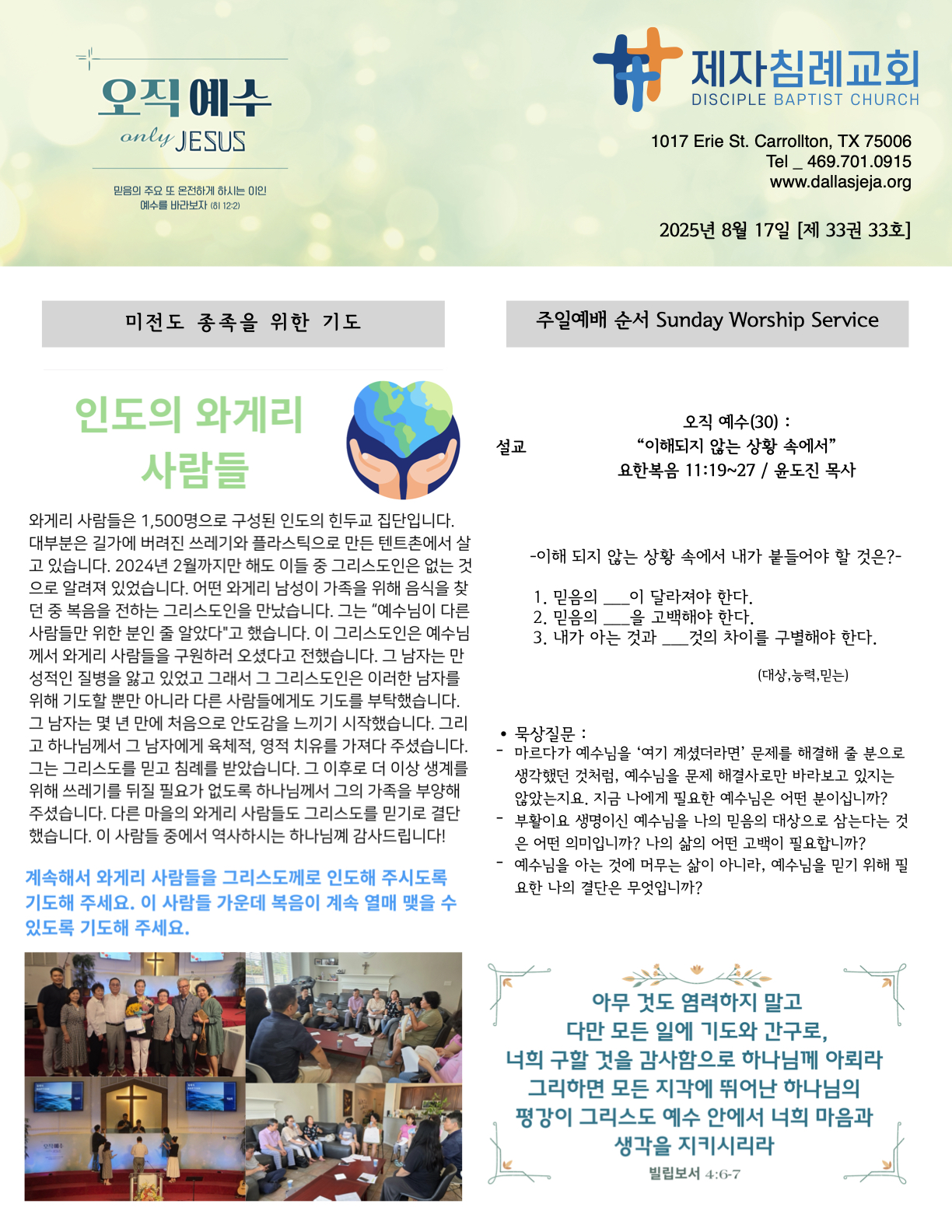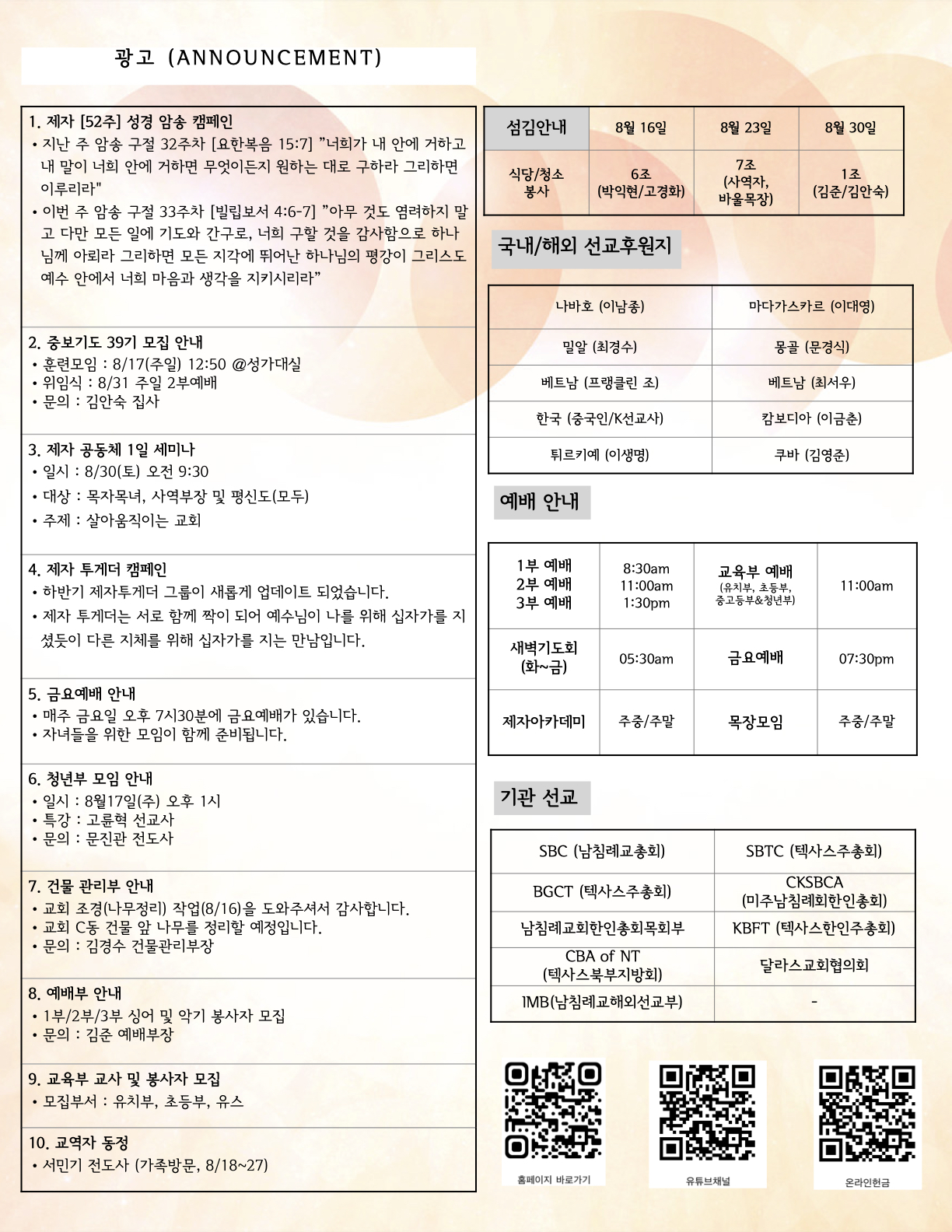 (2025.08.17) 주일 주보 페이지 정보 작성자 달라스제자침례교회 댓글 0건 조회 131회 작성일 25-08-16 11:22 목록 본문 - 이전글(2025.08.24) 주일 주보 25.08.23 다음글(2025.08.10) 주일 주보 25.08.09