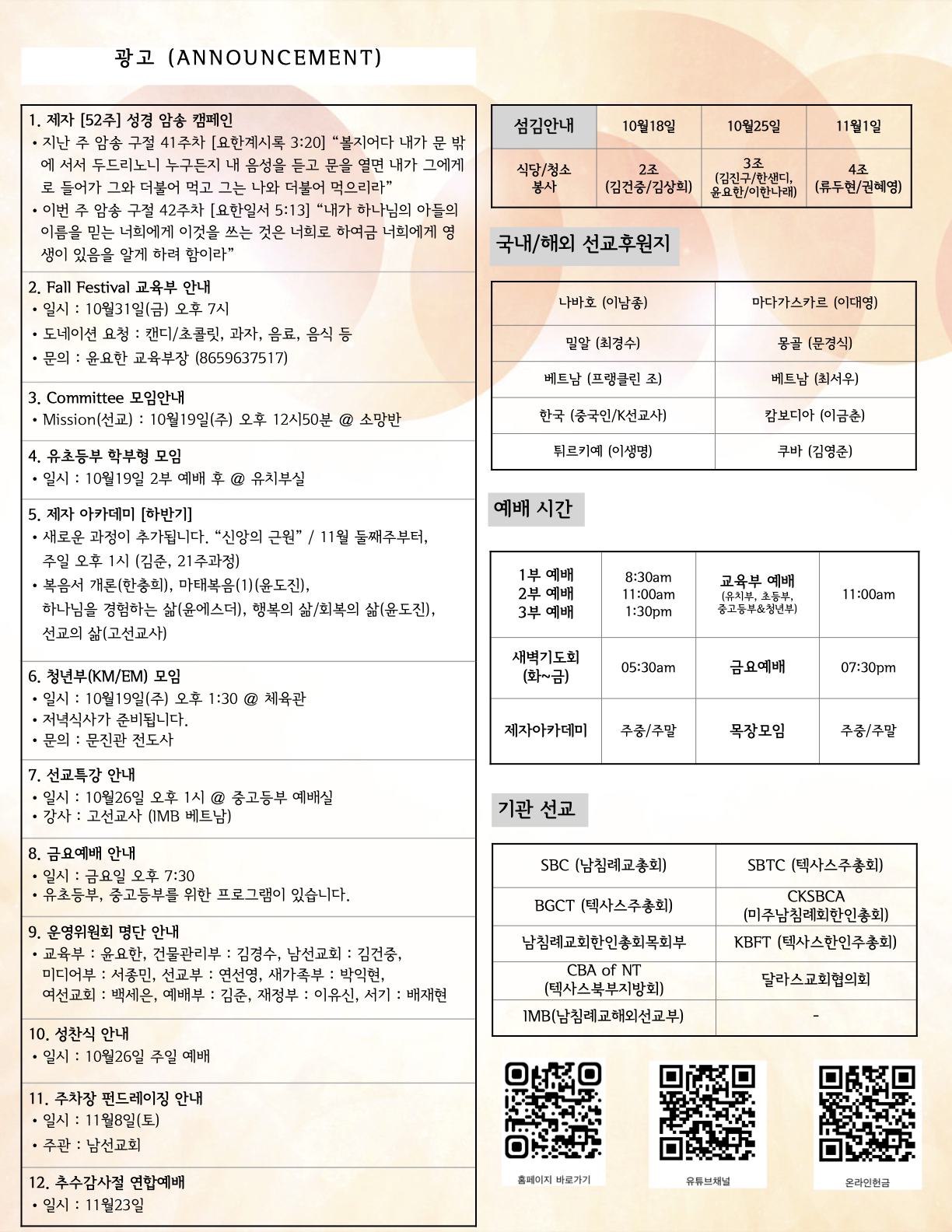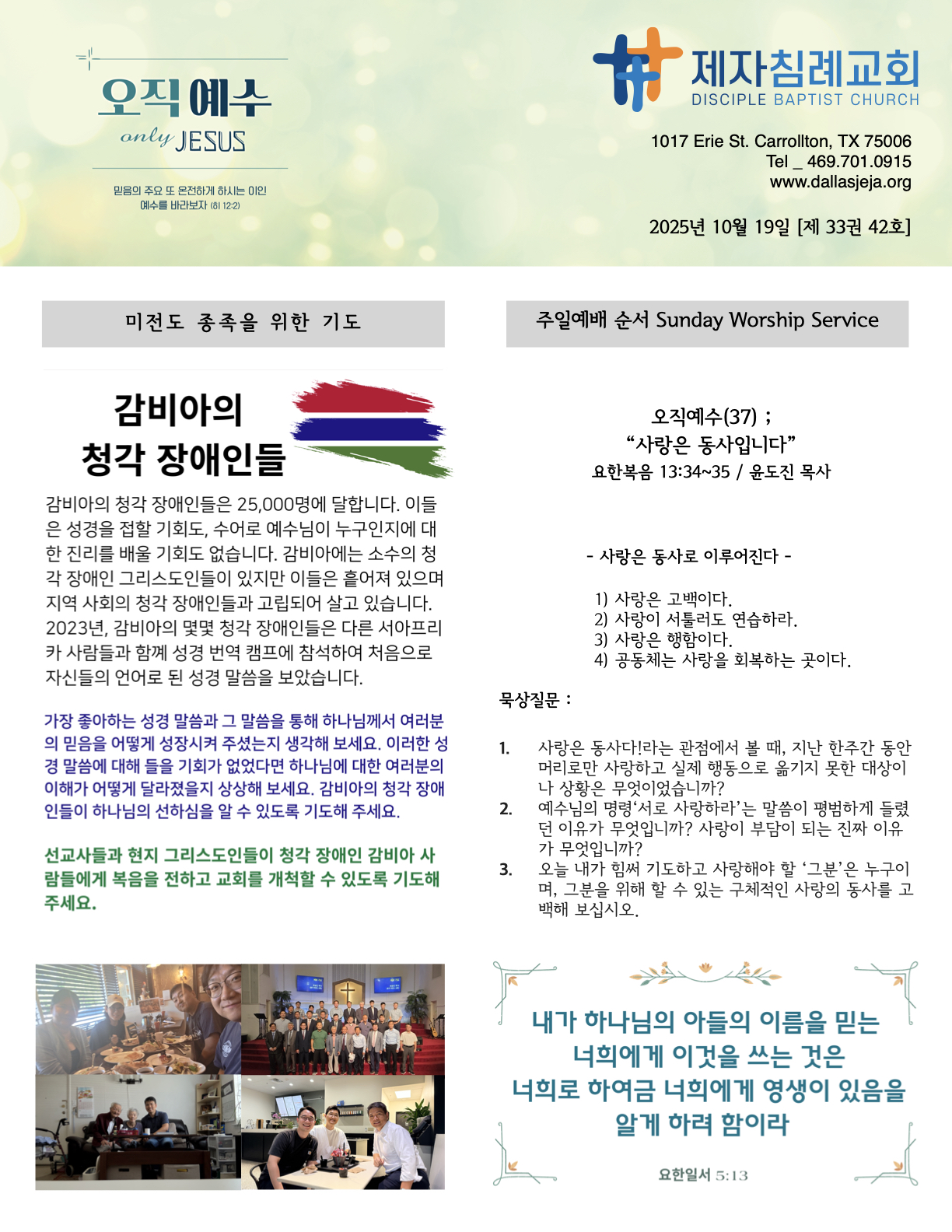 (2025.10.19) 주일 주보 페이지 정보 작성자 달라스제자침례교회 댓글 0건 조회 68회 작성일 25-10-18 10:16 목록 본문 - 이전글(2025.10.26) 주일 주보 25.10.25 다음글(2025.10.12) 주일 주보 25.10.11
