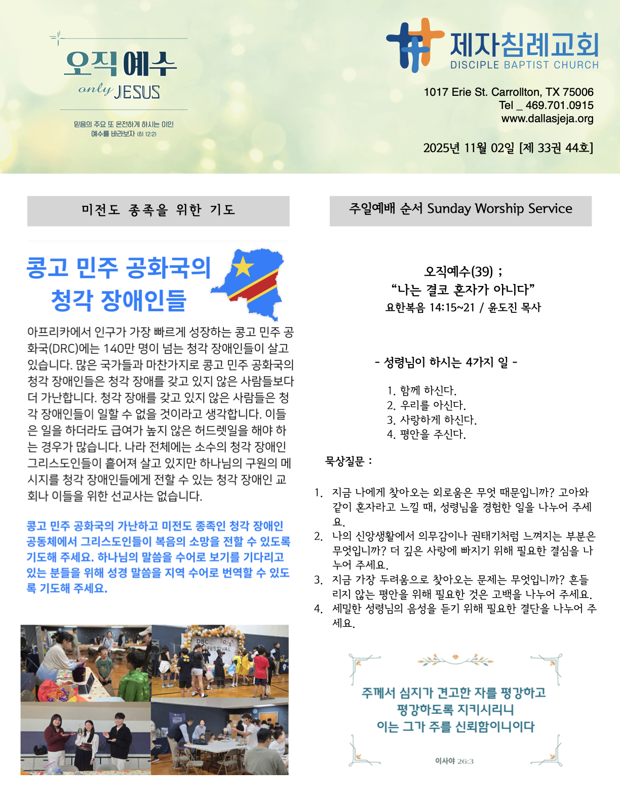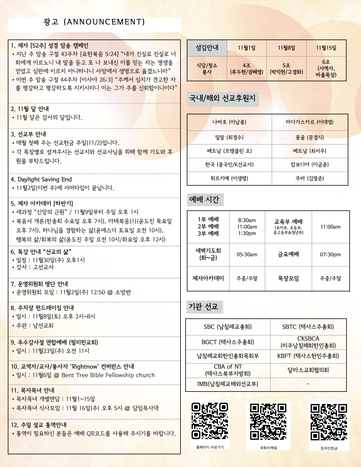 (2025.11.02) 주일 주보 페이지 정보 작성자 달라스제자침례교회 댓글 0건 조회 33회 작성일 25-11-15 17:29 목록 본문 - 이전글(2025.11.09) 주일 주보 25.11.15 다음글(2025.10.26) 주일 주보 25.10.25