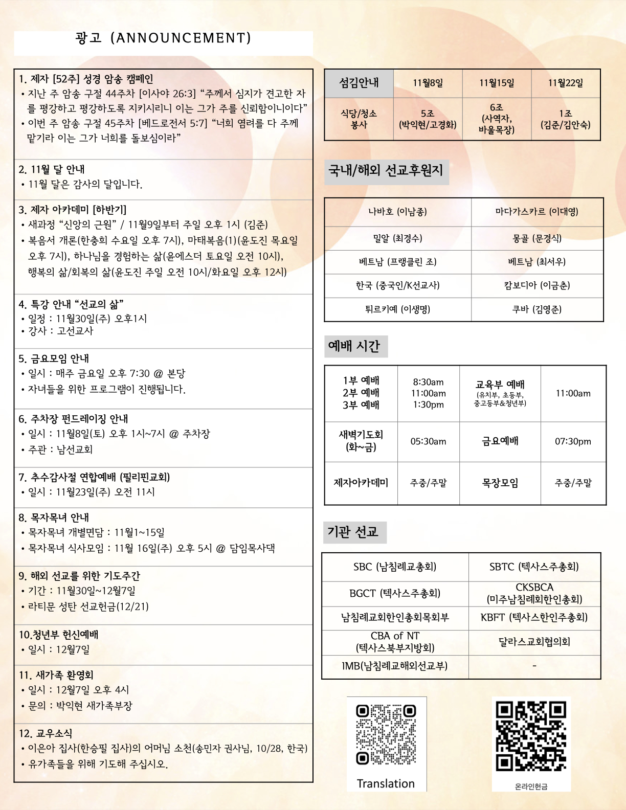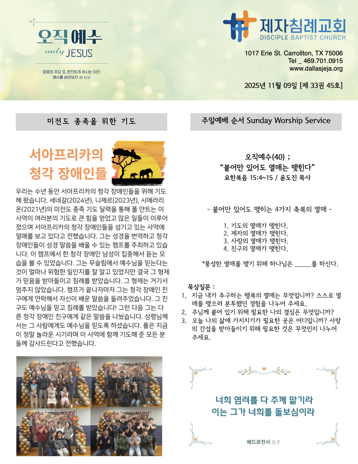 (2025.11.09) 주일 주보 페이지 정보 작성자 달라스제자침례교회 댓글 0건 조회 27회 작성일 25-11-15 17:30 목록 본문 -- 이전글(2025.11.16) 주일 주보 25.11.15 다음글(2025.11.02) 주일 주보 25.11.15